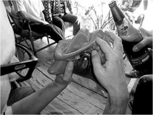 Asimismo, se cree percibir en los testimonios cierta forma de regocijo ligado al humor —lo que Sigl (2012) también describió precisamente— alrededor de la sexualidad. Encontramos objetos con representaciones sexuales que hacen reír sobre todo a las mayores, como los vasos malcriados que representan las partes genitales tanto de hombres (fig. 2) como de mujeres (fig. 3). También ríen de las bromas con carácter sexual que hacen algunos bailarines en el carnaval o en las festividades de Todos Santos. Las burlas públicas sobre las pobres prestaciones sexuales o sobre el tamaño ridículo del pene son plétoras en las coplas tanto de Carnaval como durante algunos rituales de Todos Santos (Geffroy, 2013b) y solo tienen competencia en las bromas de connotaciones sexuales que suelen hacer las mujeres de edad avanzada cuando se encuentran entre sí. Estas burlas, abiertas, sin piedad, parecen un exutorio a las tensiones acumuladas. El humor alrededor del placer manifiesto o escondido supone desplazar el placer físico per se al ámbito del discurso entre personas no implicadas en el coito (entre mujeres) y postergarlo en el tiempo. Esta actitud permite reírse de la sexualidad aun cuando puede tornarse en un factor de violencia.