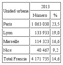 Cantidad de viviendas sociales en algunas grandes ciudades en Francia y porcentaje del total de las viviendas, en 2013