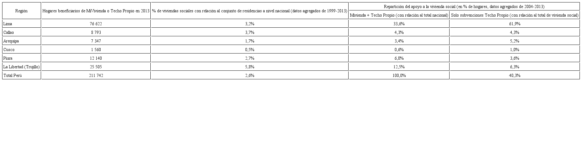 La política de vivienda social se basa en la colaboración estrecha entre el Estado, el sector inmobiliario y el sector financiero. El objetivo principal es facilitar la adquisición, la construcción y el mejoramiento de la vivienda. El Estado no produce ni vende viviendas sociales, rol que recae en los promotores privados que conciben, financian, ejecutan y comercializan proyectos de vivienda. Por su parte, el Estado estimula la demanda y facilita el acceso a las financieras intermediarias (Instituciones Financieras Intermediarias-IFI) o da una subvención directa a los hogares de bajos ingresos (Bono Familiar Habitacional-BFH). De esta manera, hay que diferenciar la «vivienda social», dirigida a la clase media y media alta, de la «vivienda de interés social», que está reservada para las familias menos favorecidas. Desde 2009, a través de los créditos hipotecarios del Fondo MIVIVIENDA S.A., el Estado ofrece el Bono del Buen Pagador que es una ayuda económica cuyo objetivo es promover el acceso al crédito.