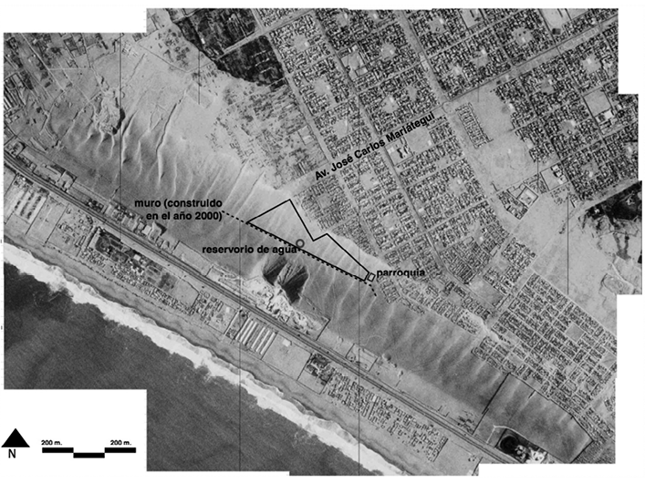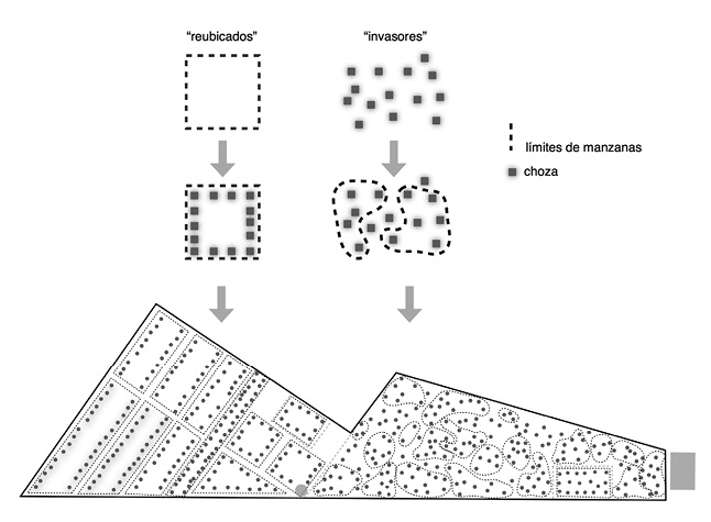 Como se ve en el esquema siguiente (fig. 3), en Lomo de Corvina coexistían dos morfologías urbanas muy diferentes, originadas en las distintas maneras como se gestaron y realizaron las ocupaciones. De un lado de la duna habían manzanas bien delineadas, con las chozas alineadas a los bordes y un gran espacio vacío en el centro de las mismas que sería distribuido entre los futuros lotes. Las vías estaban bien definidas, aunque eran intransitables para vehículos. En la zona de los «reubicados» se decidió que cada manzana construyese un silo para uso de sus habitantes, fuera del área ocupada, en la continuación de la avenida José Carlos Mariátegui.