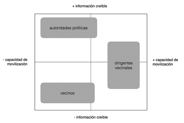 Si construimos un esquema del campo social de producción del espacio barrial, ubicamos a los actores identificados según sus dotaciones de las especies de capital —información creíble en el eje vertical y capacidad de movilización en el eje horizontal— y simplificamos la gráfica agrupando a los múltiples actores que hay en cada categoría, el resultado sería el esquema de la figura 5.