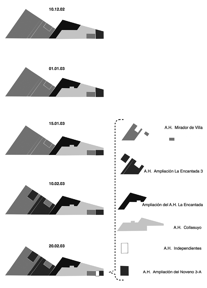 Aunque observamos modelos diferentes para la creación de la organización vecinal, en todos los casos este proceso responde a objetivos muy concretos: asegurar la posesión del terreno y, eventualmente, lograr la propiedad de los lotes de vivienda. Los nombres que se eligieron para los asentamientos humanos son muestra de las estrategias para conseguir este objetivo. El nombre «Collasuyo» estaba directamente vinculado a la organización política del Presidente de la República del momento, en un intento por ganar el favor de las autoridades políticas nacionales. En el caso de «Ampliación del A. H. La Encantada», se trataba de reforzar la idea de que no era un nuevo asentamiento humano, sino la ampliación de asentamientos humanos más antiguos. Esta estrategia, que fue también la del A. H. Ampliación del Noveno 3-A, buscaba que estas nuevas ocupaciones fueran incluidas en los beneficios de la ley que obligaba al Estado a entregar títulos de propiedad a todos aquellos que hubieran ocupado terrenos estatales antes del 31 de diciembre de 2001, ya que podía ser tomada por la institución pública encargada de «formalizar» la tenencia de terrenos del Estado como una parte del asentamiento humano más antiguo, cuya ocupación se encontraba dentro del plazo legal.