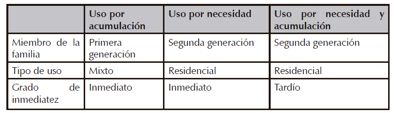 El análisis de esta etapa presenta tres lógicas de acción sobre el suelo urbano, de acumulación, de necesidad y la combinación de ambas. Las variables que permiten realizar estas distinciones parten de las siguientes preguntas: ¿qué miembros de las familias fundadoras hacen uso del predio?, ¿cuál es el uso que se le otorga? y ¿cuál es el grado de inmediatez con el que se hace uso del lote? (cuadro 1).