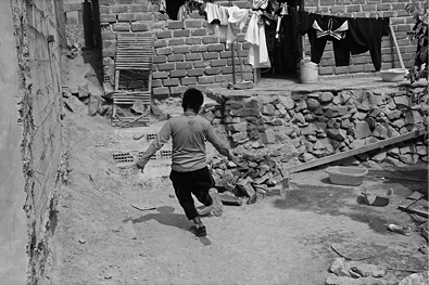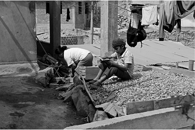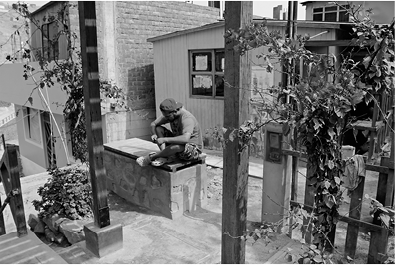 En estos espacios semicomunales se puede encontrar durante el día, la tarde y con menor recurrencia en las noches a jóvenes jugando (fig. 9), adultos conversando (fig. 10), niños leyendo (fig. 11) o simplemente personas sentadas observando lo que sucede a su alrededor o el paisaje urbano que ofrece la ladera. A saber, son actividades que podrían encontrarse en un espacio público barrial convencional de la ciudad, aunque dada la disposición difusa de estos espacios semicomunales, estas actividades se extienden de forma dispersa por todo el asentamiento. Asimismo, debido a la pendiente, están a la vista de la mayoría de sus habitantes, lo cual aumenta la sensación de simultaneidad y superposición de actividades. Esto último también permite a las familias mantener un control sobre el juego de los niños o niñas, y a la comunidad sobre su asentamiento (fig. 12).