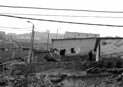 Las actividades que se pueden observar en estos espacios son desplegadas por tiempos relativamente prolongados y sin existir un límite claro entre la escalera, los retiros y las viviendas (fig. 8). Es difícil establecer una jerarquía entre los espacios debido a lo permeable de la trama del asentamiento, los bordes difusos, los materiales de construcción de las viviendas y la inclinación de la pendiente. Esto último, por ejemplo, posibilita conectar el techo de una vivienda —a veces solo usando una tabla de madera— con una escalera u otro espacio comunal ubicado en la parte superior, convirtiendo al techo de la vivienda en una extensión provisional e improvisada de un espacio semicomunitario para alguna actividad en concreto y por un corto lapso de tiempo.