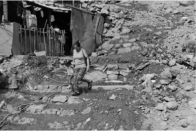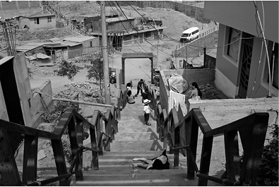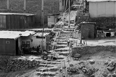 Es así que, en la zona de laderas, usualmente el espacio público se encuentra entre los últimos componentes urbanos a pensar o consolidar puesto que: (1) la construcción de las viviendas ha ocupado gran parte del espacio disponible en el asentamiento; (2) la pendiente dificulta muchas veces la réplica de espacios públicos convencionales; (3) en muchos asentamientos la consolidación del hábitat es precaria, lenta y ausente de inversión pública, debido a la irregularidad en la propiedad del suelo13; y finalmente, (4) producto del tráfico de terrenos se han invadido los pocas áreas reservadas para espacios comunes o ampliaciones. Sin embargo, como se menciona anteriormente, esto no impide que exista una dimensión colectiva y que esta no se manifieste como componente urbano dentro de la trama física.