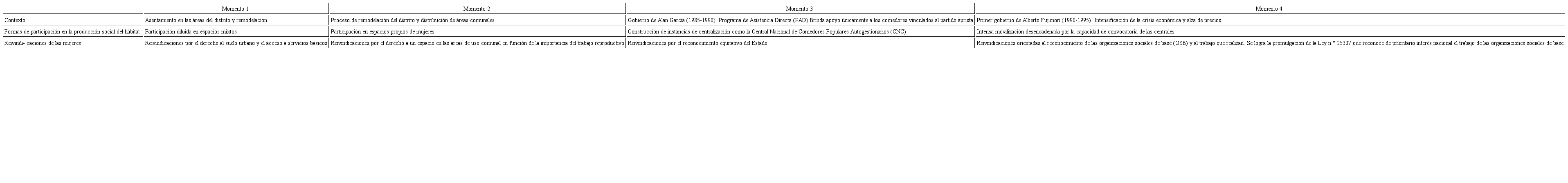 Siguiendo la propuesta de Fraser, analizar el comedor popular como un contra-público implica también poner atención en las repercusiones que tiene en el «espacio discursivo», en este caso los espacios de deliberación colectiva sobre los asuntos públicos. Para ello, es necesario analizar la evolución de los discursos y de las demandas enarboladas por las lideresas que participan de dichos espacios. Con base en las historias de vida de las lideresas, es posible identificar cuatro momentos, como se ve en el cuadro 1.