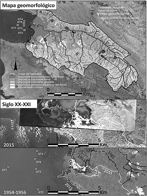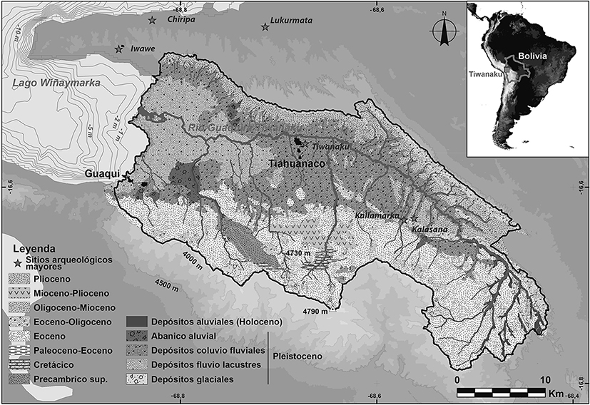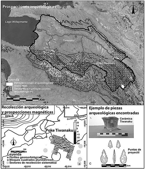 Además, si bien los trabajos preexistentes permitieron identificar y caracterizar los grandes conjuntos geomorfológicos del valle bajo y medio del río Guaquira-Tiwanaku, en cambio, el conjunto de la cuenca hidrográfica alta queda sin estudiar. Pasa lo mismo con la evolución paleo-geográfica de las orillas del lago y de los ríos, mientras que la observación de los mapas geológicos y de las fotos aéreas permite hacer resaltar una importante movilidad de las formas aluviales cuya cronología todavía no puede ser determinada con precisión.