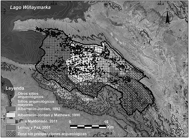 El valle del río Guaquira-Tiwanaku presenta una importante concentración de sitios arqueológicos. Los primeros índices de la ocupación humana en este valle remontan al principio del Holoceno (~11 000 cal. BP) (Uhle, 1903; Erickson, 1996; Kolata, 2003; Hastorf, 2004; Albarracin-Jordan, 1992; Janusek, 1999; 2008; Capriles & Albarracin-Jordan, 2013). Desde la Crónica de Perú de Cieza de León (1984 [1553]) varios científicos concentraron sus trabajos en el sitio monumental de Tiwanaku (Stubel & Uhle, 1892; Créqui-Montfort, 1904; Posnansky, 1911). A partir de los años 1970, Maks Portugal Zamora y Max Portugal Ortíz (1975) concentraron sus trabajos principalmente en el sitio de Callamarka, localizado en el valle alto. Trabajos más extensivos fueron realizados por Juan Faldín & Louis Girault (1978) en el valle central. Este estudio permitió identificar 36 sitios arqueológicos. Hacia los años 1980, Juan Albarracin-Jordan hizo una primera prospección en el valle bajo, identificando 50 sitios arqueológicos del período Formativo, Tiwanaku y post-Tiwanaku. El mismo año, James Mathews estudió el valle central (Mathews, 1992). Estos dos últimos investigadores hicieron una síntesis del conjunto de esos resultados para dar una visión más completa del valle del río Guaquira-Tiwanaku. En 2001, nuevas prospecciones permitieron estudiar una parte del valle alto (Lémuz & Paz, 2001). Por último, en 2011, Sergio Alejandro Calla Maldonado realizó una prospección sobre una parte del valle alto (fig. 2). El sitio de Tiwanaku, localizado en el centro del valle medio (Bennett, 1934; 1946; Ponce San Ginés, 1971; 1972; Couture, 1993; Aconini Mujica, 1995), el de Iwawe, en la península de Taraco (Burkholder, 1997; Isbell & Burkholder, 2002) y el sitio de Lukurmata, en el valle del río Katari en el norte del valle del Rio Guaquira-Tiwanaku (Bermann, 1993; 1994) dieron también lugar a varios estudios.