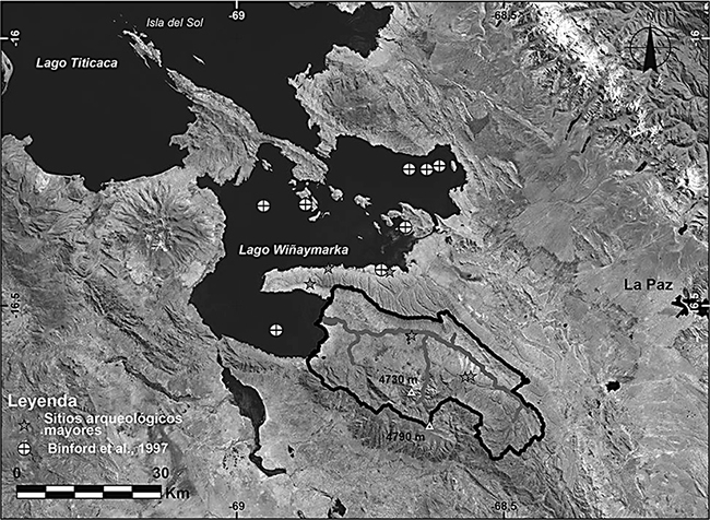Numerosos sitios periféricos de la cuenca hidrográfica, contemporáneos de la ocupación Tiwanaku, son todavía muy poco estudiados. Las partes baja y media de la cuenca hidrográfica del río Guaquira-Tiwanaku dieron lugar a numerosas campañas de excavaciones y prospecciones. En cambio, la parte alta no dio lugar a ninguna investigación arqueológica. En ausencia de datos sobre la morfología de la llanura aluvial, la repartición de esos sitios no puede ser comprendida de forma clara.
