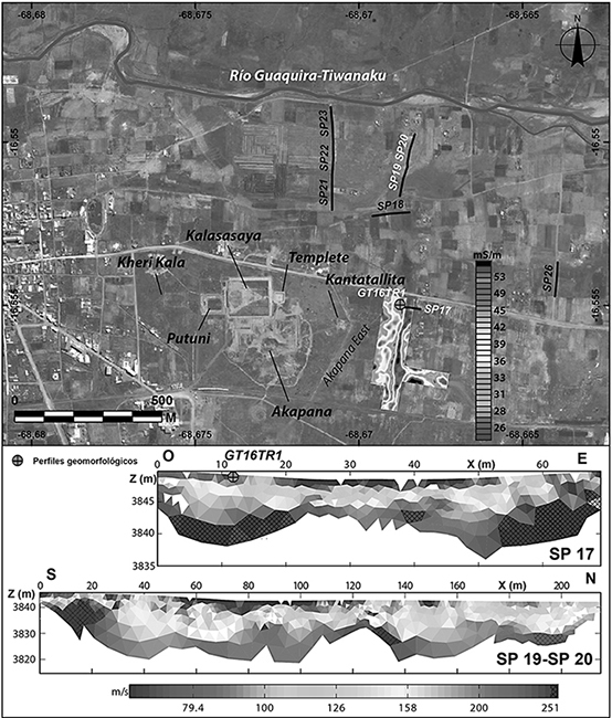 El análisis de las propiedades mecánicas de los sedimentos gracias a las prospecciones sísmicas tiende a identificar los paleocanales y la profundidad del llenado sedimentario holoceno de la llanura aluvial del río Guaquira-Tiwanaku y de las estructuras antrópicas con vocación hidráulica como los canales que rodean el sitio arqueológico monumental. Esas prospecciones permiten orientarnos hacia los sectores que van a dar lugar a extracciones de testigos sedimentarios (fig. 6).