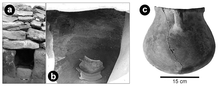Los nichos de Tulán están constituidos por portales con jambas y dinteles no convencionales, en cuanto «perforan» el muro perimetral a diferencia de aquellos más comunes con el fondo sellado (fig. 3a). Las cámaras se han techado con grandes lajas horizontales complementadas con bloques acumulados, adosados al exterior del muro perimetral e incorporados a la arquitectura del templete (fig. 3b ). Los nichos están presentes inicialmente en estructuras arcaicas tardías, y se han hecho más numerosos con las primeras comunidades pastoralistas formativas localizadas en quebrada Tulán al este del salar de Atacama. Sin embargo, no se han identificado hasta ahora templetes con nichos en asentamientos vinculados con la fase Tilocalar localizados en Puripica (Pu-31 B) y Gatchi, al NE de San Pedro de Atacama (Núñez, 2005; Adán & Urbina, 2007; Agüero & Uribe, 2011).