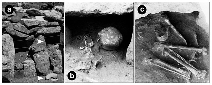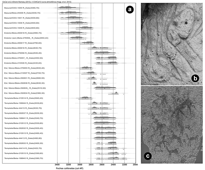 En el nicho n.° 12 y en un momento en que la acumulación de descartes no alcanzó a cubrir su parte superior, se introdujo el cráneo y parte de la caja toráxica de un cuerpo adulto (figs. 10a, 10b y 10c). El resto del esqueleto, a nivel del cráneo, quedó expuesto fuera del nicho. La datación de uno de los nichos del orden de 815-765 a. C. se considera sincrónica con otras fechas del templete, con variaciones dentro del rango. Los rasgos a nivel del piso del templete cercanos a los nichos se han datado previamente en el fogón estructurado n.° 5 correspondiente a 2630 AP / 2850 a 2720 cal. AP (900-770 cal. a. C.). El foso con los infantes 11 y 12 se fechó a los 2550 AP / 2780 a 2370 cal. AP (820 a 420 cal. a. C.), mientras que el infante n.° 23 se fijó en 2530 AP / 2760 a 2370 cal. AP (810 a 420 cal. a. C.). Una reciente datación del comienzo de la ocupación fuera del templete se ha determinado a los 2540 AP / 2735 a 2465 cal. AP (785 a 515 cal. a. C.). De modo que se esperaría que entre los eventos fundacionales datados los nichos fueran parte de la ritualidad inicial. Por otra parte, al observarse la reiteración del patrón de ofrendas, es posible que la mayoría se dispuso en torno a la datación del nicho n.° 6.