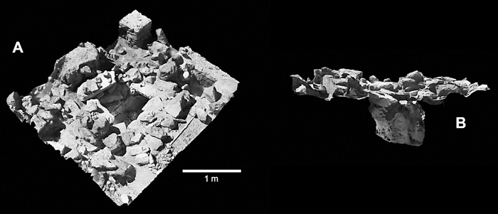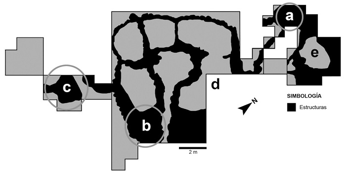 Para examinar la conexión entre los nichos y las cámaras se retiraron los sedimentos superficiales sobre los «techos» en ciertos sectores ubicados frente a los nichos; a continuación se procedió a excavar desde el interior del templete, por la apertura de los nichos seleccionados, para evaluar la existencia de posibles ofrendas entre ambos. Para contextualizar el contenido de estas cámaras se excavó una de factura menor que estuviera sellada y vinculada con una estructura ceremonial complementaria al templete, con el fin de extrapolar su función con aquellas mayores no excavadas (figs. 4, 5).