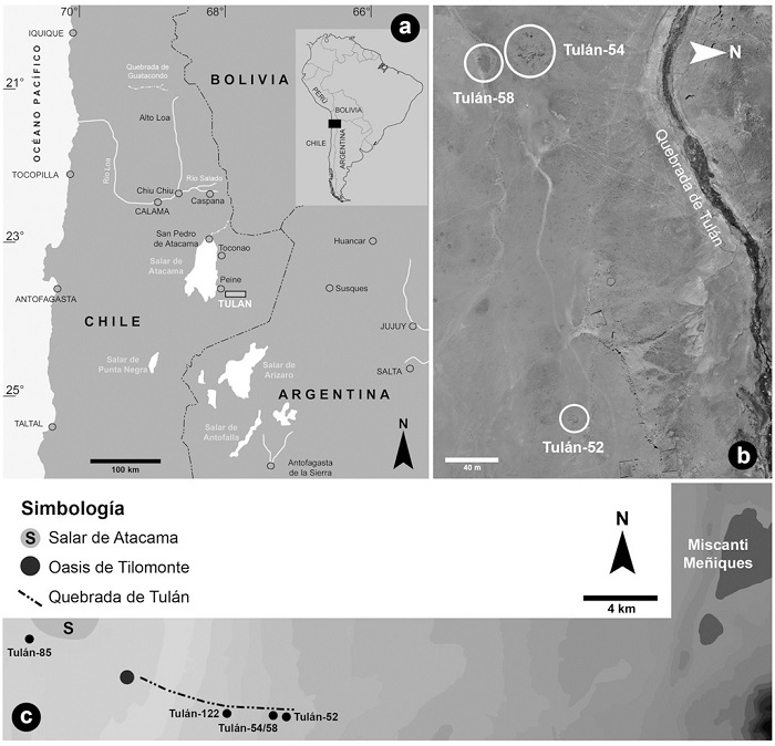 Se han identificado más nichos en el asentamiento Tulán-122, correspondiente a la fase Tilocalar, ubicado a unos 3,5 km aguas abajo de Tulán-54, junto a recintos asociados a restos domésticos, donde se han documentado 153 estructuras, algunas aglomeradas y la mayoría dispersas. Presentan atributos formativos tempranos, tanto en su arquitectura como en la materialidad cultural, datados en 2740 AP (3230 a 2960 cal. AP / 1280 a 1010 cal. a. C.). Se trata de ocupaciones pastorales móviles, sin depósitos estratigráficos potentes, que habrían ocupado este espacio de un modo temporal e intermitente (Núñez et al., 2006). Por otra parte, el análisis cerámico indica que los contenedores adquirieron un carácter expeditivo (Kalazich & Ugarte, 2008). Se destacan nichos alrededor del recinto y en casos aislados hay un nicho en cada estructura (fig. 6b), sugiriendo que aún no se habían integrado completamente en estructuras de mayor complejidad como en el templete de Tulán-54.
