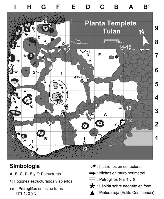 De acuerdo con estudios previos, tanto el templete Tulán como las estructuras y depósitos de su entorno han sido considerados partes de un centro ceremonial convergente que incluyó uno o más templetes (investigación en curso). Se destacan diversos componentes: inhumaciones de infantes con ofrendas jerárquicas, fogones estructurados, bloques con arte rupestre —destacándose grabados con cabezas de camélidos y cortes longitudinales— inhumaciones de adultos bajo emplantillados de rocas y un cementerio anexo. Todo fue cubierto deliberadamente con materiales descartados residuales in situ o trasladados desde áreas de actividades externas, conformando un túmulo extendido. No obstante, restaba identificar el rol de los portales o nichos y las respectivas cámaras adosadas (Núñez et al., 2017a).