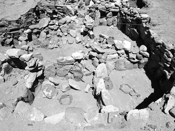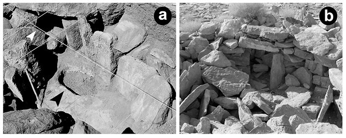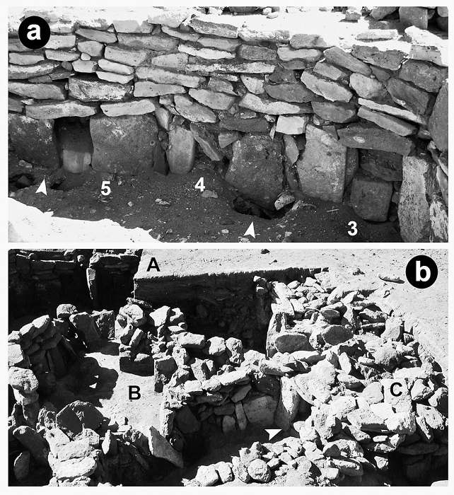 La presencia de nichos se ha distinguido inicialmente durante la fase arcaica tardía Puripica-Tulán al sureste de la Circumpuna de Atacama, más precisamente en la arquitectura ceremonial arcaica correspondiente al sitio Tulán-52, datado entre los 3450 y 2250 a. C. (fase Puripica-Tulán: 5290-4840 a 4430-4090 cal. AP), situado a unos 800 m del templete Formativo Temprano ubicado en Tulán-54 (fig. 6a). Se han decapado dos estructuras subcirculares estrechas con nichos construidos con lajas verticales. El examen de la estructura mayor expuso descartes y prácticas rituales, plasmados en un monolito abatido en línea con el muro, un foso de ofrendas vacío a nivel de piso y un nicho compuesto por dos jambas que sostienen un dintel apegado al muro y que se comunica con una pequeña cámara abatida (De Souza et al., 2010). Bajo el dintel se encontró un bloque mueble con grabados longitudinales, similar a otros distribuidos en varios sectores del sitio, iguales a los recurrentes durante la siguiente fase Tilocalar. De este modo, los nichos, aun con escasa frecuencia, se asocian a actividades ceremoniales en recintos estrechos de uso no doméstico, en contextos de cazadores-recolectores asociados al inicio de la domesticación de camélidos (Cartajena et al., 2007).