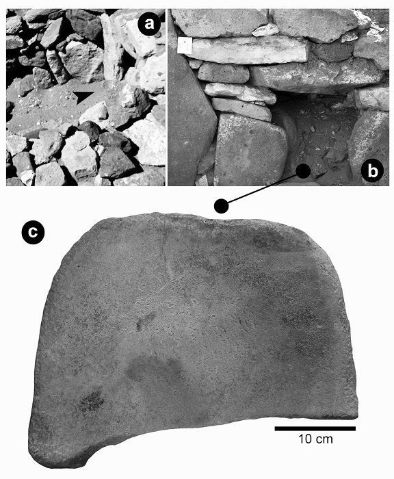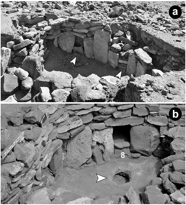 Los nichos-cámaras se asocian a rituales intratemplete, configurando un espacio vinculante con los fosos de las inhumaciones de infantes, los fogones estructurados y los diseños rupestres, que en conjunto se integran en cada estructura interior del templete (Núñez et al., 2006; 2017a). Presentan dinteles monolíticos bien conservados y/o alterados in situ, incrustados en el piso. En la base, bajo el dintel y sobre el piso, se han colocado bloques con caras planas, fragmentos de metates e incluso uno completo, que parecen haberse relacionado con algún ceremonial (figs. 8b y 8c). Tanto en jambas como en dinteles se han identificado sectores con pigmento rojo y grabados de cabezas de camélidos e incisiones, incluyendo aristas muy pulimentadas. Las aperturas de los nichos se sitúan sobre el piso y en ciertos casos en niveles más altos; en este caso, se dispusieron bloques en las bases.