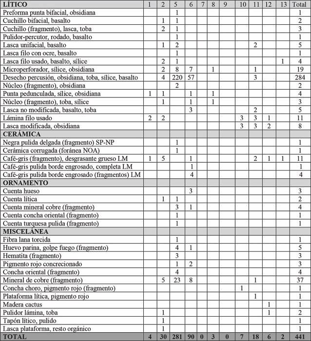 En los nichos muestreados se registraron 441 restos culturales y de fauna con frecuencias variables. Se identificaron, además, desechos de percusión, minerales de cobre ornamental, microperforadores, cuentas, fragmentos cerámicos, restos de conchas marinas y terrestres del oriente, incluidos huevos de parina (Phoenicoparrus andinus), algunos con golpe de fuego, pigmentos, piedras con ocre, hematita brillante, puntas pedunculadas, artefactos líticos varios y abundantes residuos óseos (cuadro 1). La cerámica registrada es similar a aquella de la fase Tilocalar del Formativo Temprano, ampliando considerablemente la popularidad y la escala espacial del tipo Los Morros (Sinclaire et al., 1997; Kalazich, 2006). Corresponde a la tradición Tulán-Los Morros que aparece durante la fase transicional Tarajne de 3715-3560 a 3460-3200 cal. AP (1765-1610 a 1510-1250 cal. a. C.), ampliándose su uso en la fase posterior Tilocalar, durante el desarrollo del templete Tulán entre 3450-3080 y 2410-2370 cal. AP (1500-1130 a 460-520 cal. a. C.).