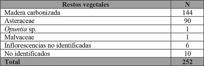 El análisis de flotación aplicado al contenido del nicho n.° 5 ha permitido identificar un total de 252 restos (cuadro 2). La mayoría de ellos corresponde a pequeños fragmentos de madera carbonizada (tamaño menor a 5 mm). Le siguen dentro del conjunto identificado los restos botánicos de la familia Asteraceae, sin determinación de especie. Sin embargo, es necesario considerar que los análisis preliminares realizados indican que las especies de la familia Asteraceae por lo general son numerosas, de modo que se presentan varios aquenios en una misma planta. Se estima que lo representado en las muestras puede corresponder solo a un máximo de 2-3 plantas de una de las especies de la familia. Se registró a su vez un fragmento de semilla de Opuntia sp. carbonizada y una semilla carbonizada de la familia Malvaceae, sin determinación de especie. Se recuperaron partes de inflorescencias no identificadas y finalmente un porcentaje menor de restos no identifiacados de los cuales seis se encuentran carbonizados.