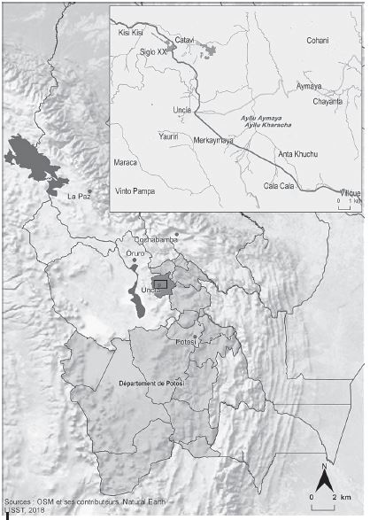 OSM et ses contributeurs, Natural EarthUn ayllu est un collectif d’humains et de non-humains partageant un territoire commun, soumis à des autorités communes et unis par des liens de parenté. Les ayllus du Norte Potosí actuel (provinces Bustillo, Bilbao, Ibañez, Chayanta et Charcas) sont situés sur le territoire de l’ancienne chefferie aymara Charka et se caractérisent par une organisation hiérarchique et segmentaire3. Chaque ayllu est en effet divisé en deux moitiés : Alaxsaya (Haut) et Manqhasaya (Bas). Divers segments s’articulent selon ce principe dualiste de division en moitiés. Le grand ayllu est formé d’ayllus mayores qui, à leur tour, se divisent en ayllus menores puis en ayllu mínimos ou cabildos, enfin en communautés4. Ce faisant, les ayllus Aymaya et Kharacha appartiennent au grand ayllu Chayanta qui comprend les ayllus suivants : Laymi, Puraka, Chullpa, Jukumani (moitié Alaxsaya), Chayantaka, Sikuya, Kharacha, Aymaya, Panakachi (moitié Manqhasaya). L’histoire régionale a été profondément marquée par des conflits entre ayllus pour des motifs territoriaux (guerres entre Laymi et Aymaya, entre Laymi et Qaqachaka, tensions diverses5). Pourtant, au sein des ayllus Aymaya et Kharacha, l’attention s’est momentanément déplacée des frontières entre ayllus vers les frontières entre parcelles: les pratiques des géomètres et leurs cadastres ont fait resurgir des litiges de voisinage qui étaient restés jusque-là tacites à propos des limites entre les parcelles.