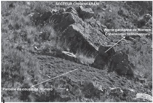 Cet exemple témoigne du fait que les pierres-gardiennes constituent aussi un support mémoriel pour identifier les différentes transactions foncières. Aujourd’hui en effet, la majeure partie des maîtres des pierres-gardiennes ne sont plus les propriétaires des parcelles sur lesquelles les pierres se situent. Contrairement au lieu d’implantation du foyer, les parcelles font l’objet de plusieurs transactions. Le corollaire est que toute pierre-gardienne a un maître indépendamment du propriétaire de la parcelle et du destin de celle-ci (que la parcelle soit cultivée ou non). Dans les ayllus, les terres agricoles sont distribuées selon deux formes d’usufruit : les canchones et les mantas. Dans le premier cas, la production est individuelle et les activités agricoles sont régies par l’unité familiale. Les mantas sont des superficies de culture très étendues, de propriété communale, et sous le contrôle du cabildo et de l’ayllu. Les mantas sont divisées en parcelles appelées qallpas sujettes à la rotation préétablie des cultures, laquelle est déterminée par l’ayllu, le cabildo, ou la communauté27.