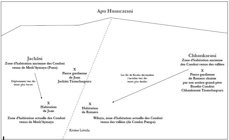 Par contraste, le voisin de Romero, Juan Condori, a sa pierre-gardienne dans la zone appelée Jachäsi (fig. 7). L’emplacement de ces deux pierres-gardiennes est ici très instructif. Dans la communauté d’Urur Uma baja, la majorité des personnes portent le même patronyme : Condori17. Cependant, les Condori se divisent en deux groupes : 1) les Condori de Wiluyu venus des vallées (de Condor pampa) comme Romero et, 2) les Condori venus de Merk’Aymaya (Ayllu Kharacha, Province Bustillo) comme Juan18 (fig. 8). La distinction de ces deux familles Condori s’objective spatialement puisqu’elles vivent de part et d’autres de la rivière Liwichi (aujourd’hui asséchée)19. L’emplacement de ces pierres-gardiennes constitue ainsi un support historique permettant de retracer l’histoire des peuplements de cette région : les deux zones où se situent les pierres-gardiennes (zone Chhankarani pour les Condori provenant des vallées et celle de Jachäsi pour ceux provenant de Merk’Aymaya) correspondent effectivement à des zones d’habitation plus anciennes, aujourd’hui délaissées. Les personnes sont descendues vers des terres plus fertiles et plus proches des rivières, déplacement qui les a conduites à choisir une autre pierre-gardienne. Selon Romero (né dans les années 1950), sa pierre-gardienne (et celle de ses frères) aurait été choisie par son arrière-grand-père, Baselio Condori. Le grand-père de Romero (Luciano Condori) aurait conservé la pierre-gardienne de Baselio (père de Luciano), alors que ses frères en auraient choisi une nouvelle au moment de leur déplacement vers des zones plus fertiles et de leur fondation d’un foyer-famille20. C’est en effet à cette génération que les familles changèrent de zones d’habitation. Cette migration explique qu’aujourd’hui, Romero (et ses frères) n’ait plus la même pierre-gardienne que ses cousins paternels (les descendants de Baselio): «c’est normal qu’on n’ait plus la même pierre-gardienne aujourd’hui, ils ont en choisi une autre car nous ne sommes plus des germains». La pierre-gardienne de Romero se trouve en effet sur le terrain (canchón) de son cousin Felix. Celui-ci a hérité de la parcelle et la cultive depuis. La pierre-gardienne de Felix se situe quant à elle sur une parcelle à proximité de sa maison qui appartient néanmoins au frère de Romero, Modesto. La parcelle appartenait en effet au père de Romero et fut ensuite divisée entre Romero et Modesto.