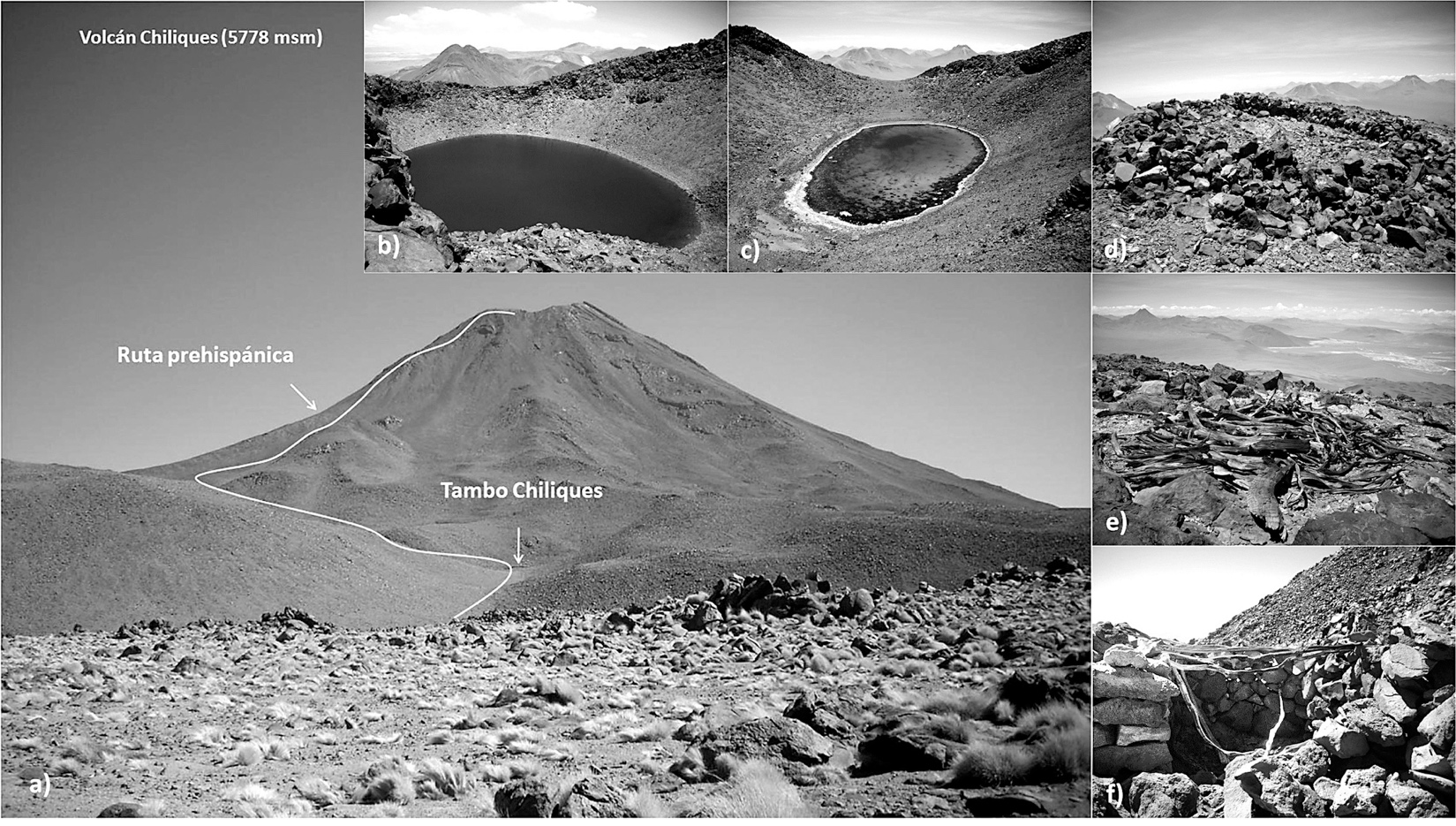 a) Vista general Chiliques, b-c) Lagunas cumbre, d-e) Círculo ceremonial y madera cumbre 5778 m s.n.m., f) Estructura techada 5700 m s.n.m.