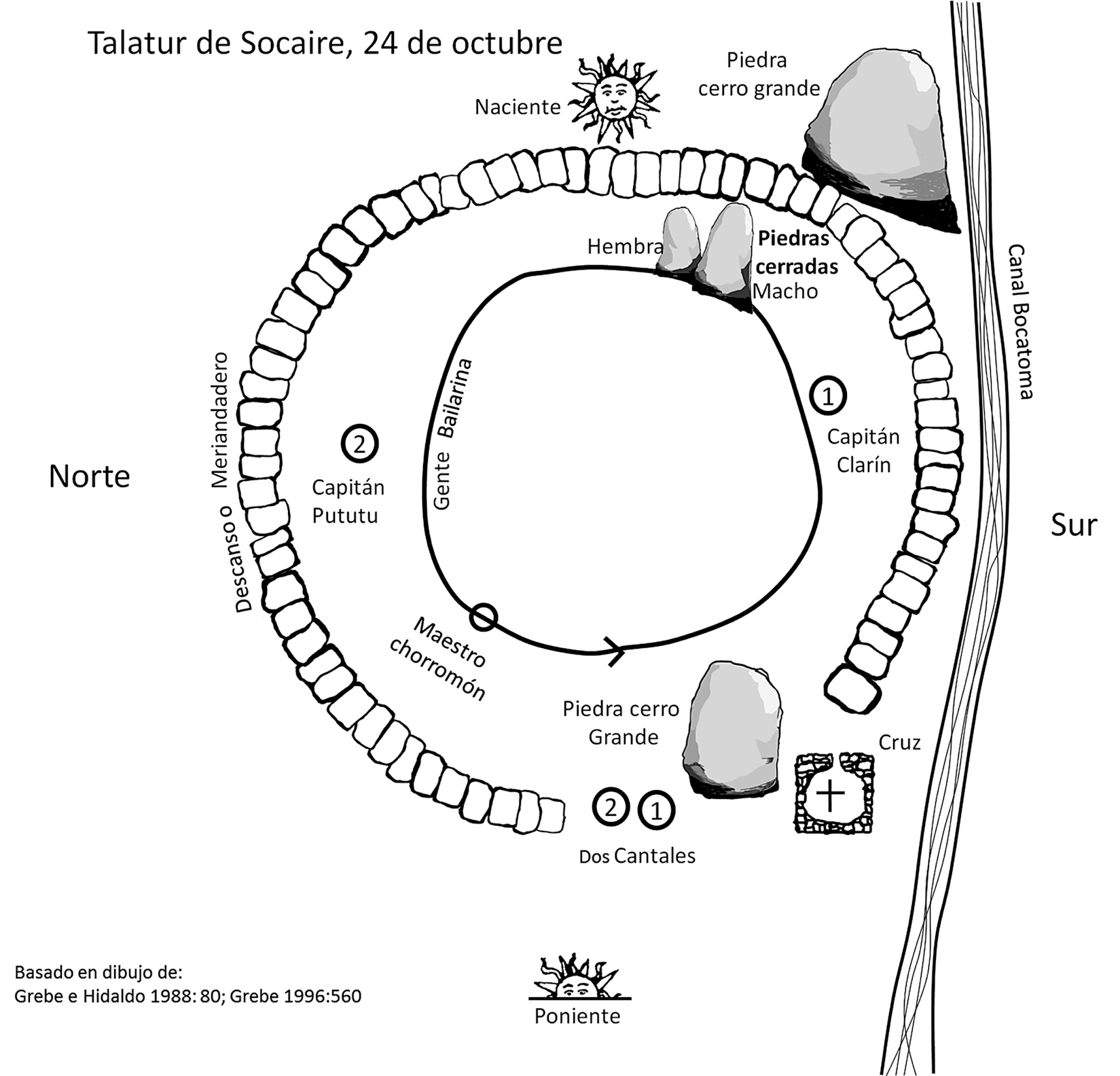Fotos: Ricardo Moyano. Elaboración figura: Ricardo Moyano, Jeannette Cruz y Patricio BustamanteGrebe & Hidalgo (1988) publicaron un dibujo del centro ceremonial de Socaire, que corresponde a un croquis realizado por Don Laureano Tejerina, cantal de Socaire (fig. 8). En la imagen se distingue claramente el círculo de piedras que forma el «merendadero o descanso» abierto hacia el suroeste, donde se ubican los dos cantales junto al covero. En la parte de arriba (el este), se dibujan las dos piedras que representan a los cerros. Desde el punto de vista del Sol, la piedra de la izquierda o «macho» se vincula con el sur, mientras que la piedra de derecha o «hembra» se vincula con el norte. En el extremo suroeste de la imagen se ubica el «cerro grande» (piedra plana), junto al covero y la señal de la cruz, lugar conocido para la quema de ofrendas y considerado el más sagrado del lugar. Al interior del círculo se agrega el sentido del movimiento de los bailarines del talatur en contra de las manecillas del reloj, similar al movimiento diario que tiene el Sol. Al interior de la rueda se pone al maestro (especialista) del chomorrón (campanillas) girando en el mismo sentido que los bailarines. Fuera de la rueda, pero dentro del merendadero, se coloca al capitán y el putu o pututo[5] en el norte, opuesto al capitán o principal con el clarín en el sur. Fuera del círculo de piedras, se ubican los dos cantales, el principal a la izquierda y su ayudante a la derecha. El cantal (especialista ritual y quien precisamente aprende el canto del sonido del agua del canal) se ubica junto al merendadero, al sur, contiguo a una gran roca conocida como «piedra cerro grande» en la parte sureste del dibujo (Grebe & Hidalgo, 1988: 80).