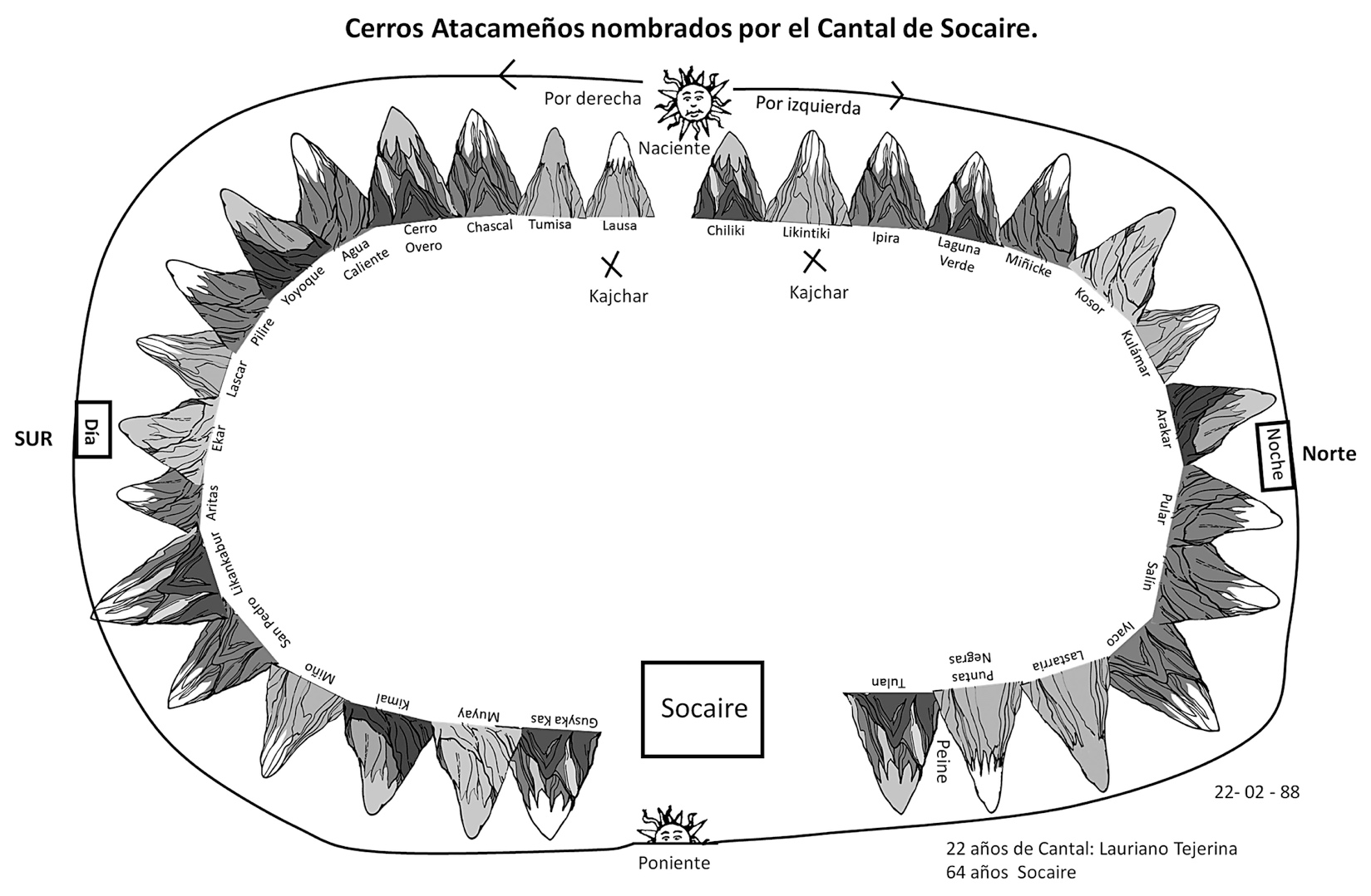 Grebe & Hidalgo (1988) presentan una reproducción de la zona atacameña a partir de otro croquis de Don Laureano Tejerina, donde se muestran dos semicírculos con el Sol naciente en la parte superior, el Sol poniente en la parte inferior y a Socaire como un cuadrado ubicado en la parte baja de la imagen. El cantal invierte el norte y el sur geográfico (sin una razón conocida), asociando al primero con la noche y la izquierda y al segundo con el día y la derecha. Coloca dos cruces, una a la izquierda y otra a la derecha, dentro de los semicírculos que representan las botellas de aloja o kajchar. Los cerros del grupo sur se nombran desde el este, siguiendo el sentido de las manecillas del reloj: Chiliki, Likintiki, Ipira, Laguna Verde, Miñiki, Kosor, Kulámar, Arakar, Pular, Salín, Iyaco, Lastarria, Puntas Negras y Tulan; mientras que los cerros del grupo norte, se nombran también desde el este, pero en el sentido contrario a las manecillas del reloj: Lausa, Tumisa, Chascal, Cerro Overo, Agua Caliente, Yoyoque, Pilire, Lascar, Ekar, Aritas, Likankabur, San Pedro, Miño, Kimal, Muyay y Gusyka Kas. Esta lista contiene un total de 30 cerros: 14 para el grupo sur y 16 para el grupo norte. Se destaca el hecho de que se ubique al poblado de Peine entre los cerros Puntas Negras y Tulan, al suroeste. El norte (sur geográfico) lo ubica entre Arakar y Pular, y el sur (norte geográfico) entre los cerros Aritas y Ekar (Grebe & Hidalgo, 1988: 82) (fig. 9).