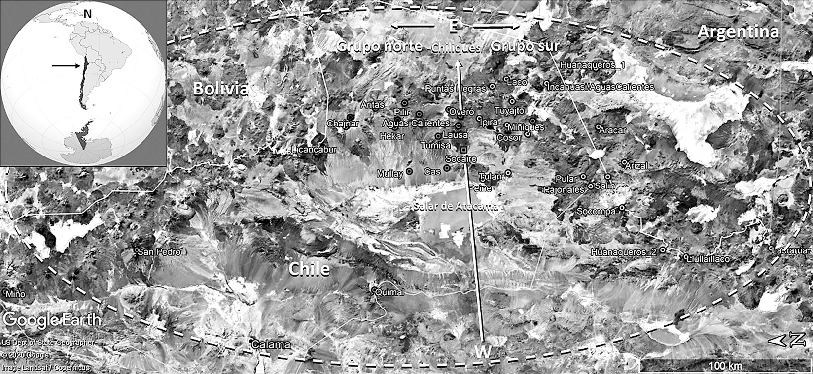 La comunidad Atacameña (Likan Antai) de Socaire se ubica en el extremo suroriental del Salar de Atacama, norte de Chile (23˚35’28’’S, 67˚52’36’’W, 3274 m s.n.m.) (fig. 1). Esta parte del desierto de Atacama corresponde a una cuenca endorreica, con escasas precipitaciones, entre la cordillera de Domeyko y los Andes, con alturas que fácilmente pueden superar los 5000 m s.n.m.. Previo a la llegada de los españoles, la región formó parte del Collasuyu o parte sur del Imperio de los inkas (Tawantinsuyu) y concentró una cantidad importante de campos de cultivos o chacras, minas de cobre y plata, además de una población indígena permanente en las cercanías de los actuales poblados de San Pedro de Atacama, Toconao y Peine (Núñez, 1993).