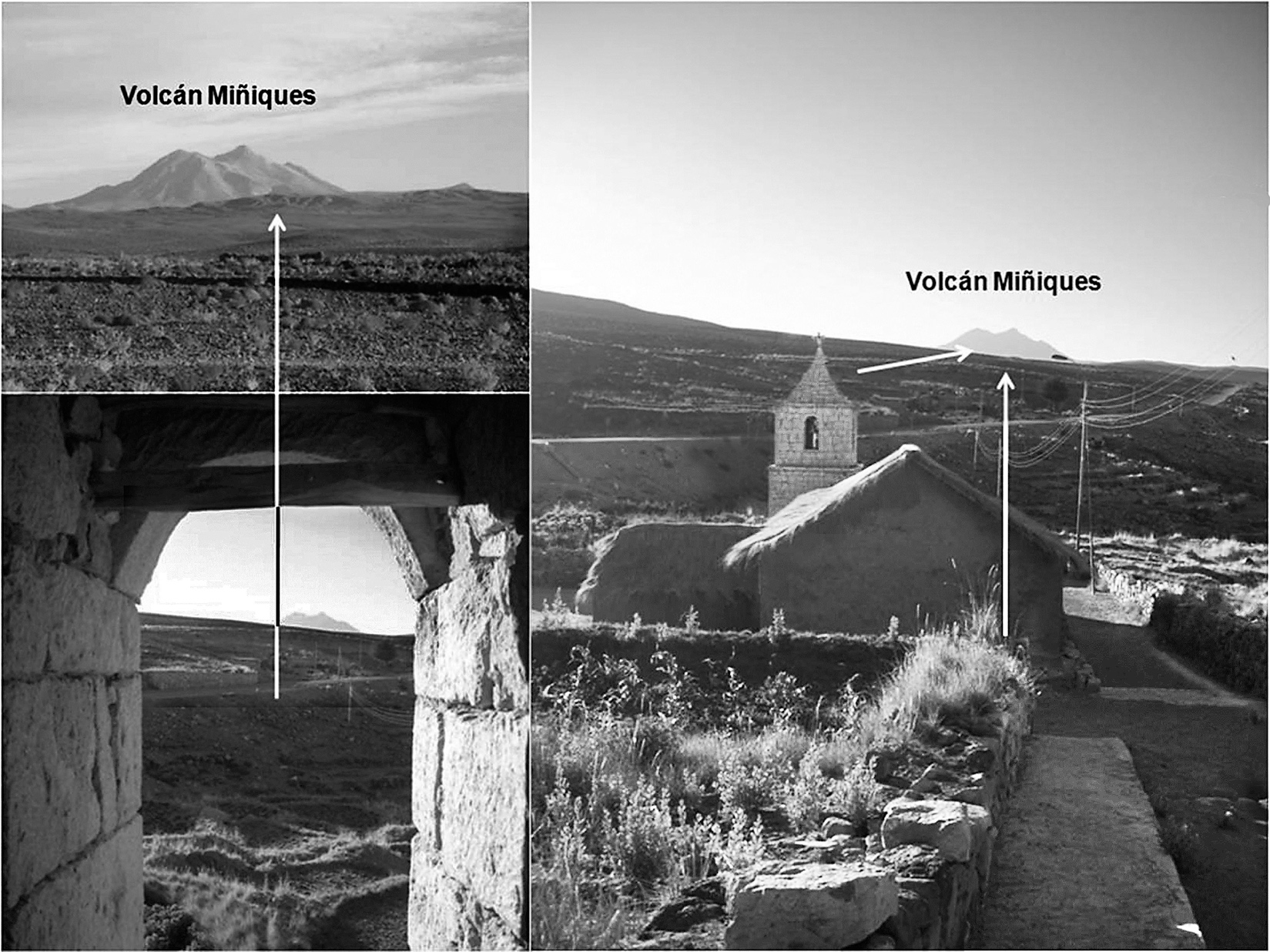 En la última década, desde la etnoastronomía, se propone la existencia de posibles líneas de mira o «convido» en Socaire, además del reconocimiento de topoformas en el paisaje (Moyano, 2011). Estos trabajos señalan la identificación, por parte de la población local, de formas pareidólicas entre los volcanes Tumisa, Lejía (Lausa), Chiliques (Chiulucke), Miscanti (Ipira) y Miñiques (Minicke)[1], vinculados con la salida del Sol en los solsticios y equinoccios y la asociación de Miñiques con el dedo más pequeño de una mano izquierda extendida en el horizonte (Moyano et al., 2018) (fig. 3). En esta propuesta sobresale la concepción cíclica y variable del tiempo, las dinámicas de sacralización del espacio, y sobre todo, las peregrinaciones como parte de una explicación animista del entorno (Curatola Petrocchi, 2016), cuyo énfasis pudo estar en la naturaleza sagrada de las cosas o maickos, según la concepción atacameña (relato recuperado por Josefa Cruz 2020, comunicación personal), así como en la capacidad de los especialistas andinos por entablar comunicación con las entidades de la naturaleza, particularmente el agua y las montañas, desencadenando posibles pareidolias visuales y auditivas[2].