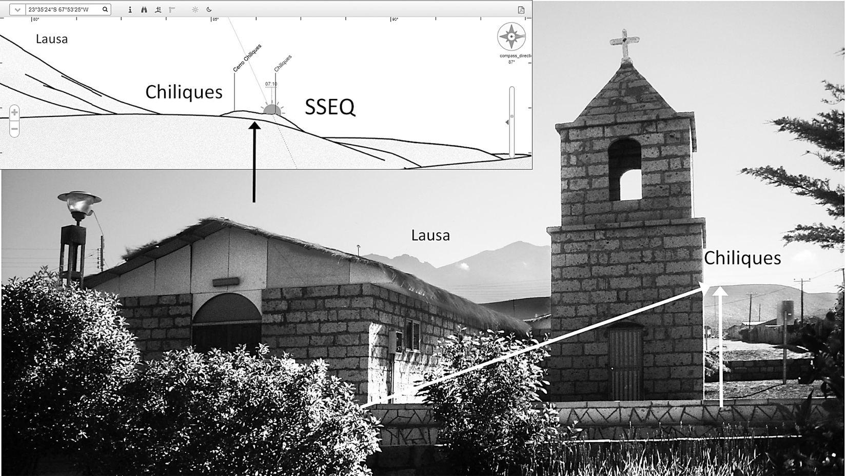 Esta representación de la topografía tiene su lectura a escala en el merendadero del centro ceremonial. Allí, dos piedras grandes y verticales, ubicadas al este representan a la «piedra hembra» a la derecha, y a la «piedra macho» a la izquierda, como también al volcán Chiliques. De igual manera el círculo de piedras, la disposición de la ofrenda de aloja, los oficiantes y la danza del talatur con su movimiento circular, representarían la posición de cada cerro o lugar dentro del sistema local. Por lo tanto, desde el punto de vista del calendario, se puede asegurar que la variante del sistema de ceques en Socaire al menos integra tres marcadores del horizonte (desde el centro ceremonial): para el día de San Bartolomé, el 24 de agosto, en el volcán Chiliques; para el solsticio de verano, el 21 de diciembre, en el volcán Ipira, además de un marcador presolsticial (14 de junio), en una de las cumbres de volcán Lausa; junto a la orientación orográfica de la iglesia antigua del poblado hacia el volcán Miñiques (Minicke) y nuevos datos que señalan la relación equinoccial de la iglesia actual (construida en la década de 1980), con la salida del Sol en los equinoccios sobre el volcán Chiliques (figs. 12 y 13).