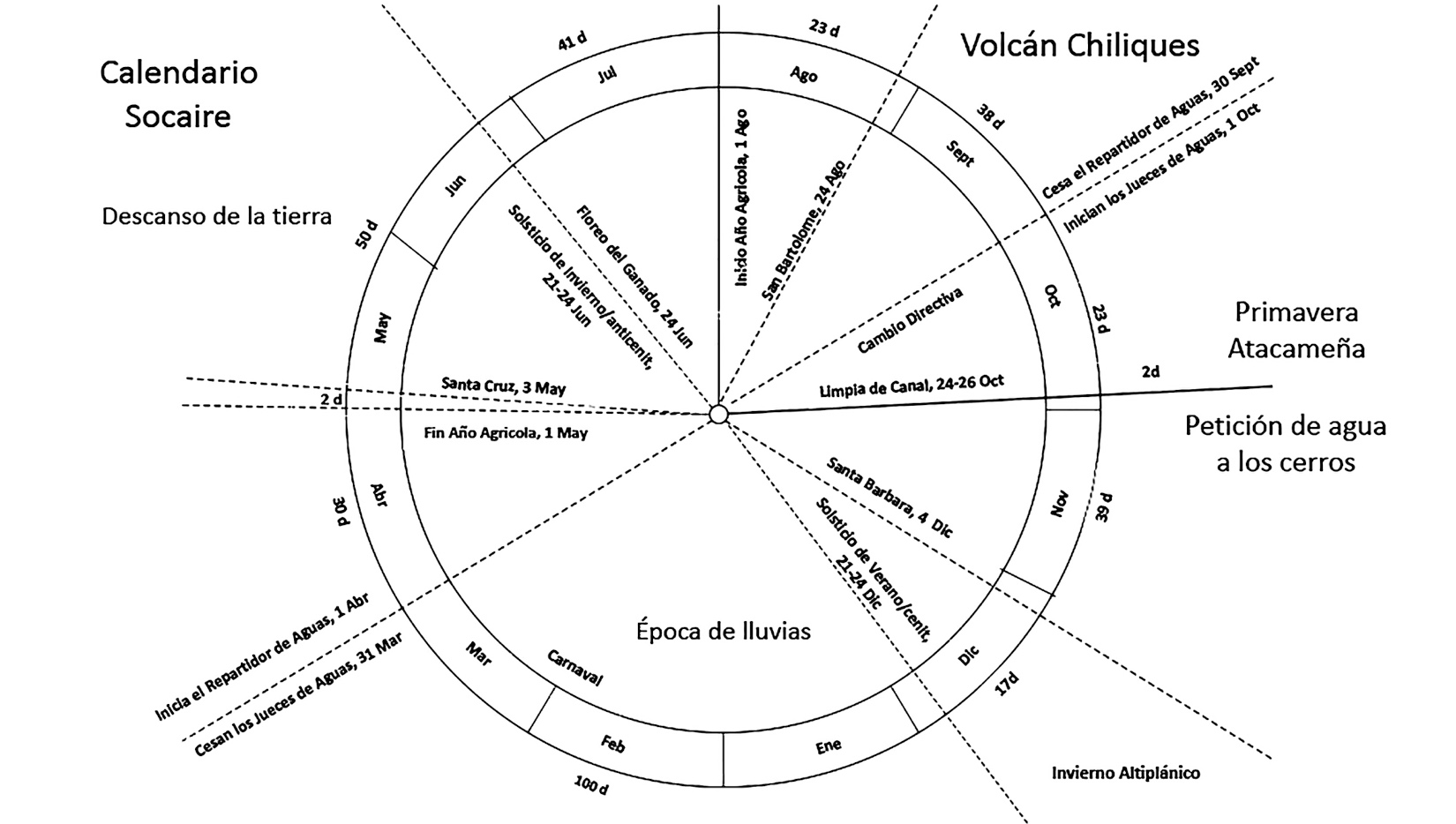 El manejo colectivo del tiempo —y por ende del espacio— tiene su expresión social en Socaire a través del calendario agrícola y ritual. Este inicia durante el mes de la pachamama con la primera siembra y la fiesta de San Bartolomé, el 24 de agosto, seguido por el cambio de los responsables del agua (encargado y jueces) entre finales de septiembre e inicios de octubre. Durante este mes tiene precisamente lugar la fiesta más importante del año, que es la limpia de canales y la petición de lluvias entre los días 24 y 26 de octubre. Sigue la fiesta de Santa Bárbara, el 4 de diciembre, el tiempo de Carnaval entre fines de febrero e inicios de marzo, el segundo recambio de los encargados del canal, entre fines de marzo e inicios de abril, la cosecha ritual (fin del año agrícola), el 3 de mayo (Santa Cruz) y finalmente el floreo de los animales para el solsticio de invierno y la fiesta de San Juan, el 24 de junio (Barthel, 1986 [1957]) (fig. 2).