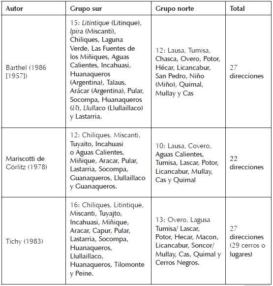 Desde la década de 1950 existen antecedentes de tradiciones locales en relación con la producción agrícola, el culto a los cerros y las fiestas del calendario ritual (Barthel, 1986 [1957]). Aquí, destaca la ceremonia de limpia de canales de fin del mes de octubre (primavera atacameña), momento durante el cual se invocan a las montañas del sector, a través del canto y el baile del talatur, junto con distintas ofrendas de comida y bebidas alcohólicas (Grebe, 1996; Grebe & Hidalgo, 1988). Barthel, en su etnografía de 1957 (1986), da cuenta de un total de 27 direcciones sagradas o cerros invocados durante la petición de lluvias (15 cerros para el grupo sur y 12 cerros para el grupo norte) (cuadro 1). Esta versión podría asumirse como la original, teniendo como antecedente que estos lugares poseen en su mayoría sitios arqueológicos prehispánicos y que la tradición de los cantales o especialistas rituales de la comunidad, se mantuvo intacta hasta mediados del siglo pasado. En 1978, Mariscotti de Görlitz solo da cuenta de 22 direcciones, 5 menos que la versión de Barthel, con 12 cerros para el grupo sur y 10 cerros para el grupo norte. Tiempo después Tichy, en 1983, informa acerca de un total de 27 direcciones, con 16 líneas para el grupo sur donde incluye a los poblados de Peine, Tilomonte y cerro Capur, y 11 direcciones para el grupo norte. En ambos casos se plantea la posibilidad de relacionar a algunas montañas con fenómenos astronómicos de horizonte, particularmente los solsticios.