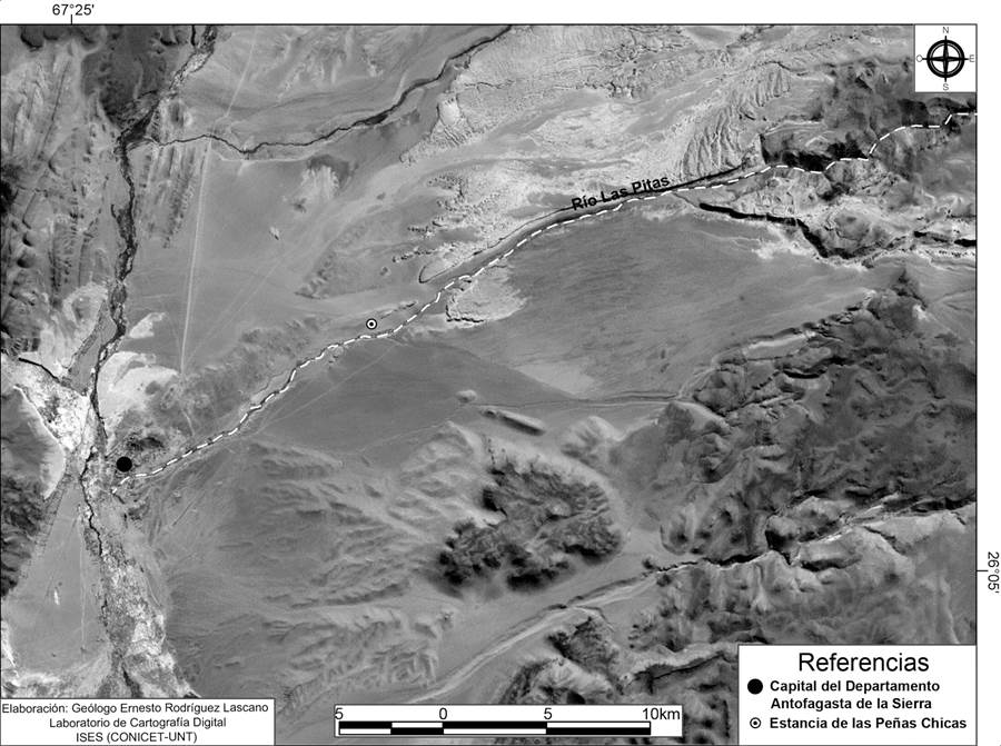 Las evidencias textiles fueron recuperadas en la estancia de las Peñas Chicas (EPCh). Propiedad de la familia Morales, fue construida a fines del siglo XIX y habitada hasta mediados de la década de 1930; se ubica a unos cinco kilómetros al noreste del pueblo de Antofagasta (fig. 3), a 200 metros de la margen norte del curso medio-inferior del río Las Pitas y a 3543 m s. n. m. (coordenadas: 26° 01 58” S y 67° 21 3” W). La estancia estuvo incorporada a un circuito familiar que incluía el «domicilio grande» en Falda de Ilanco (donde residían parte del año), mientras que la EPCh era habitada durante los meses más cálidos (desde octubre hasta marzo-abril), de manera que junto al «domicilio grande» conformaban las cabeceras de un circuito que también incluía otros corrales, puestos y una casa en el pueblo. Se emplaza contigua —en su límite este— a una peña de ignimbrita (de 12 metros de altura). La unidad doméstica combina el espacio residencial (al norte) con el productivo (un corral al sur), construcciones separadas por un pasillo —de unos tres metros y medio de amplitud— que posibilita el acceso a distintas dependencias.