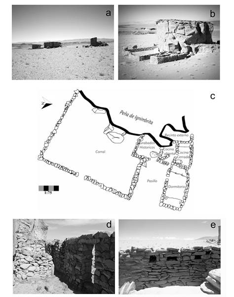 Sus constructores aprovecharon la cara plana de la peña para construir allí la estancia —empleando como materia prima rocas de ignimbrita—, la que además la resguardaba de los fuertes vientos. La EPCh, entonces, está compuesta por un corral de unos 15 x 9 metros de lado; al sur del pasillo y al norte se ubican las dos cocinas (una cerrada, otra abierta), un dormitorio y un recinto externo (fig. 4). Finalmente, donde culmina el pasillo se encuentran una serie de grabados que remiten a los integrantes de la familia Morales. Las iniciales de los nombres de casi todos sus integrantes están representadas en la peña y fueron interpretadas como parte de una estrategia para destacar ante otros —que podrían ser otras familias y/o el propio Estado— su propiedad de este sector de Las Pitas, esto es, los grabados como dispositivo identitario con el fin de marcar familiarmente este paisaje y sus construcciones (Martinez & Ataliva, 2020).