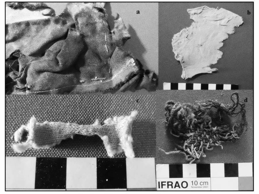 En cuanto a los textiles, la muestra se compone de 39 piezas, con una paridad significativa entre los elaborados artesanalmente y los de manufactura industrial. Respecto a la materia prima, hay una primacía de los textiles confeccionados con fibra vegetal, específicamente algodón. Se registraron tres tipos de estructura textil: plana o llana, sarga y tejido en punto. Los tejidos en punto fueron confeccionados en su totalidad con fibra de animal. Hay un marcado consumo de telas de algodón en este espacio doméstico. Con relación a los fragmentos de tejidos en punto, se vinculan con prendas de vestir, tal es el caso del tejido teñido color fucsia, que corresponde a una prenda de abrigo, como un suéter; otro de los tejidos en punto —sin proceso de tinción y elaborado con fibra animal y cuyos atributos como el diámetro grueso de los hilados y su estructura ajustada— también remite a una prenda para cobijar.