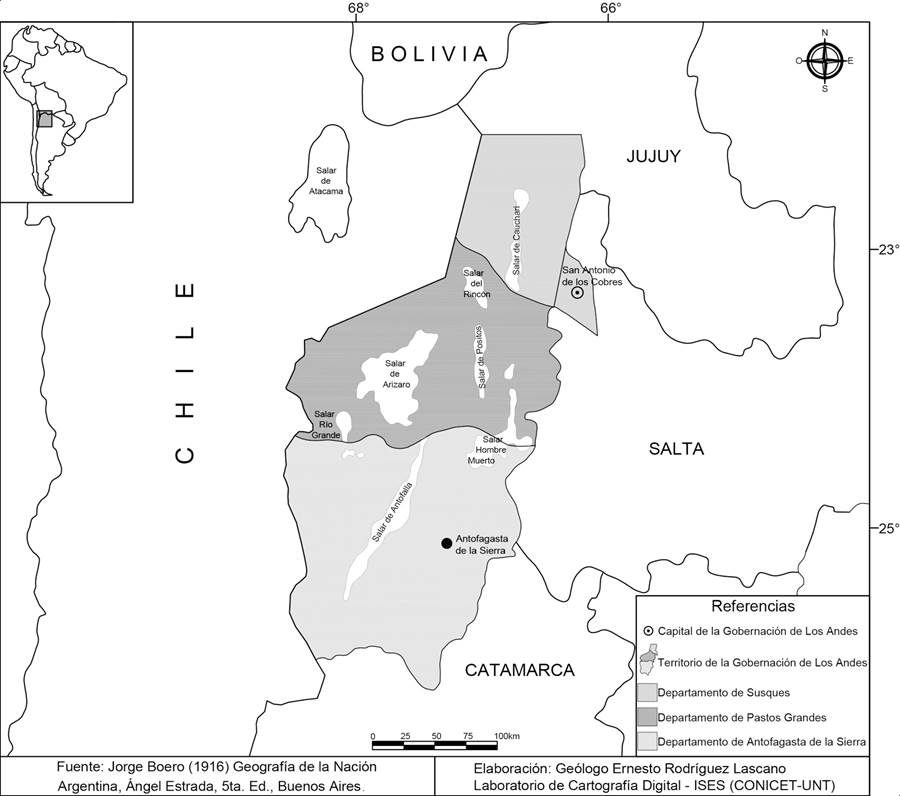 Culminada la guerra del Pacífico (1879-1884) que enfrentó a Bolivia-Perú y Chile, y tras la victoria de este último, se inician las tareas de exploración y delimitación. La Puna de Atacama —designada así en la Argentina hasta mediados del siglo XX (Benedetti, 2005)—, boliviana hasta la confrontación bélica, será recorrida, entre otros y a requerimiento de Chile, por Alejandro Bertrand y Francisco San Román, quienes publican urgentes informes entre 1885 y 1896. Finalmente, la disputa territorial entre Chile y Argentina por la Puna (1889-1899) favorece al segundo país con el laudo arbitral del 24 de marzo de 1899. Casi un año más tarde, el 9 de enero de 1900, se crea el Territorio Nacional o Gobernación de Los Andes. Los Territorios Nacionales fueron concebidos como: