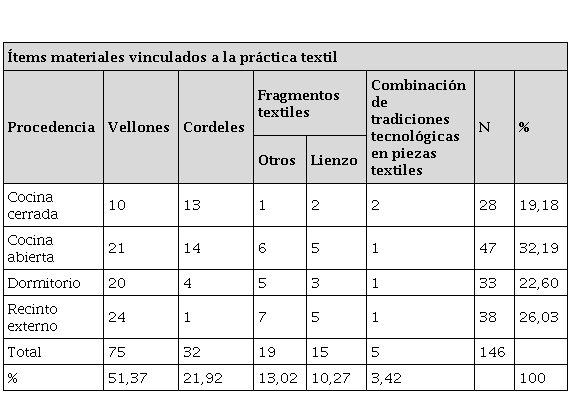 En la cocina cerrada se registra casi un 15 % de vellones (n = 75); con relación a los cordeles, hay una alta representatividad del total recuperado en todos los recintos (32), un 40 % (13); y, además, 5 piezas textiles fueron halladas durante la excavación. Mientras que en la cocina abierta se produce un aumento en el registro textil (más de un 32 % de todos los ítems analizados) en lo que refiere a los vellones (n = 21), cordeles (14) y piezas de tejido y telas (12 de un total de 39, es decir, un 31 %). En esta cocina, junto al recinto externo, se observa una de las mayores presencias de fragmentos de lienzo (en ambos, n = 5).