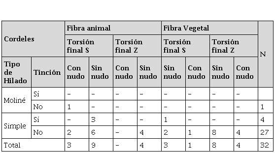 La muestra de cordelería está conformada por 32 piezas, el 50 % con fibra animal y el otro 50 % con fibra vegetal (cuadro 2). Todos los cordeles fueron confeccionados con dos cabos hilados y luego retorcidos con una torsión opuesta al hilado. Asimismo, todos los cordeles de fibra vegetal presentan un hilado simple[6]. Se distinguieron tonalidades naturales dado que no se observa evidencia de tinción en 15 de los 16 elementos de cordelería; la excepción corresponde a un cordel de hilado simple S(2z)[7], sin presencia de nudos y teñido de color azul (2.5 B 3/4). Un interesante hallazgo se vincula con los cordeles de torsión final Z, corresponde al 38 % (n = 12) del total de la muestra. Más de la mitad no presenta nudos.