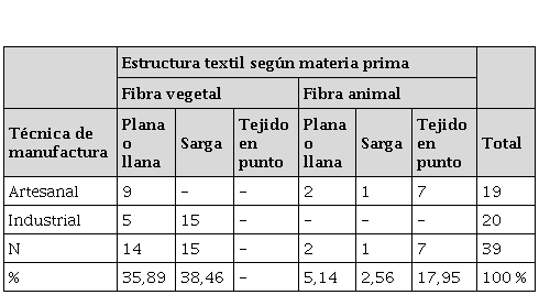 Se registraron tres tipos de estructura textil, la plana o llana, sarga[9] y tejido en punto por trama[10]. En el caso de los modos de hacer artesanales, en la elaboración del tejido aparecen representados los tres tipos de estructuras mencionadas a diferencia de las confeccionadas industrialmente, en los que no se hallaron ejemplares de tejido en punto. En cuanto a la materia prima utilizada hay una predominancia de la fibra vegetal (75 %, n = 29) por sobre la de origen animal (25 %, n = 10). Con las primeras se elaboraron 15 piezas a través de la técnica de entrecruzamiento denominada «sarga» y 14 con una estructura plana. En el caso de los textiles confeccionados con fibra animal, la mayor cantidad es de tejidos en punto, luego plana y, por último, sarga (que corresponde a un único textil artesanal con este tipo de entramado en toda la muestra).
