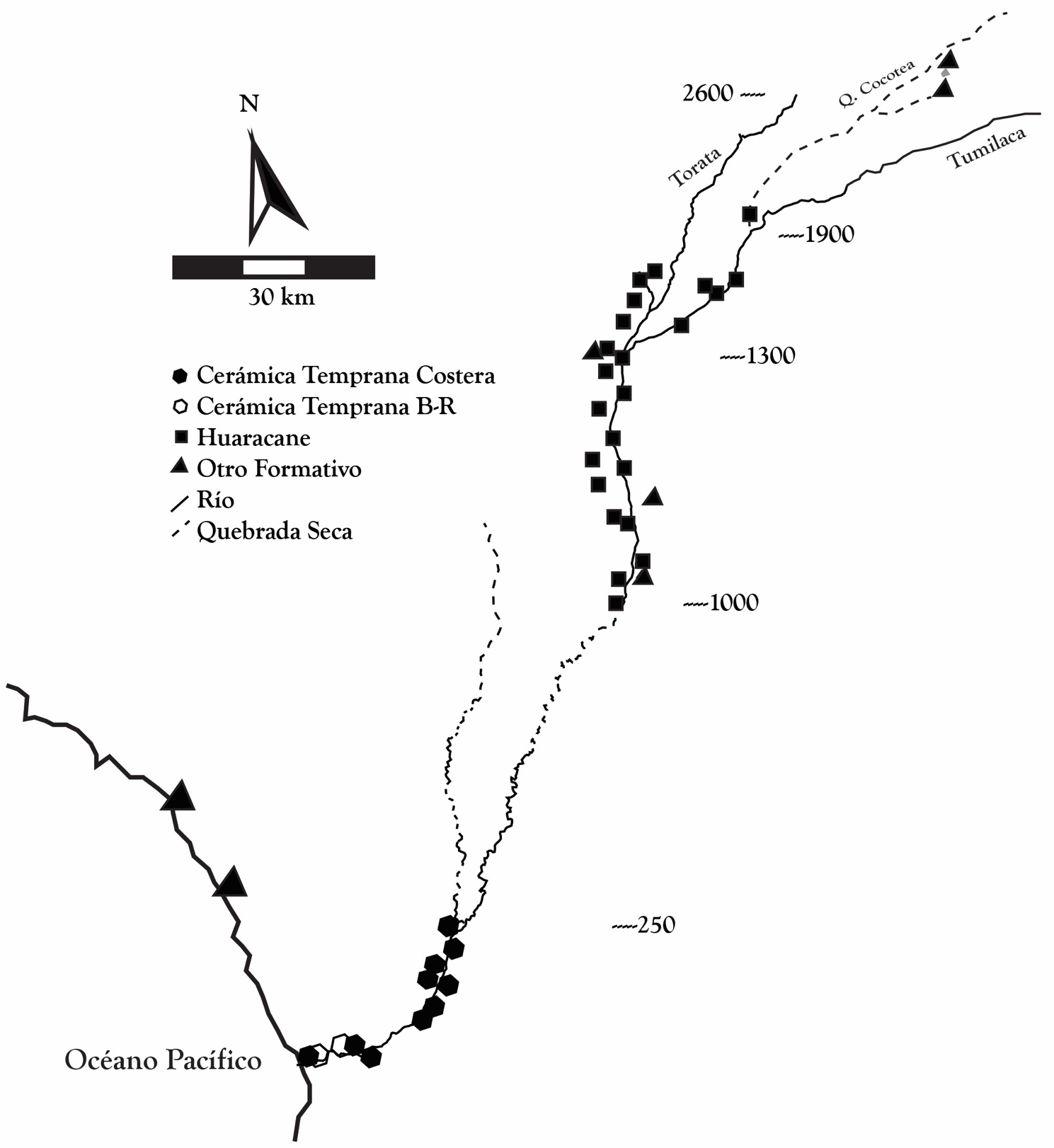 La presencia wari en Moquegua se reconoce a menudo como una colonia, pues no hubo en el periodo Formativo tardío asentamientos significativos en el área inmediata donde se construyeron los principales sitios (fig. 3). Los datos muestran que la región por encima de 3200 m s. n. m. fue utilizada en el Formativo (Cardona Rosas, 1997; Vining, 2011), el valle medio fue ocupado por grupos huaracane (Goldstein & Owen, 2001; Owen & Goldstein, 2001) y la costa fue poblada por tres o cuatro grupos de cerámica similar pero distintiva que ocuparon diferentes zonas (Owen, 1993). Si cada grupo fuera una entidad política, habría entre cinco y seis líderes locales representando a las poblaciones. En cambio, si cada uno de estos estilos cerámicos representara a varias entidades políticas competidoras más pequeñas, entonces los líderes provinciales tendrían muchos más líderes que atender, cada uno de los cuales representaría una población relativamente pequeña, al menos cuando recién llegaron a la provincia y establecieron su infraestructura. Por lo tanto, si Wari deseaba controlar a la población y organizar una economía productiva en el valle, tenía que hacer inversiones, crear infraestructura e interactuar con numerosos líderes de pequeños grupos en lugar de uno o dos representantes de grandes organizaciones políticas centralizadas. Sin duda, el menor tamaño de las entidades políticas en Moquegua facilitó la incursión, pero dificultó su transformación en una provincia rentable.