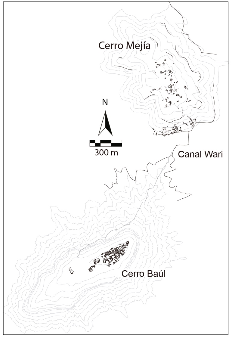 Dado que el Picchu Picchu también se ve desde ambos templos en forma de D en Cerro Baúl, los funcionarios wari pueden haber continuado ahí los ritos de adoración a la montaña de la capital, mientras creaban un nuevo lugar para compartir y legitimar prácticas ceremoniales con la población local. El complejo de plataformas puede ser una práctica local, porque las construcciones de montículos alrededor de una plaza están presentes en el sitio Huaracane de Yahuay Alta (Costion, 2013), pero no son para contemplar la montaña. Es posible que los complejos de plataformas en Cerro Baúl y Cerro Mejía copiaran un espacio ceremonial del lugar para cooptar el ritual local y mezclarlo con el suyo (ver Schreiber, 2005). La disposición del complejo de plataformas puede representar un compromiso entre las prácticas locales y Wari que se desarrollaron a partir de interacciones mutuas y se construyeron sobre atributos comunes a ambos. El complejo de plataformas en Cerro Baúl es pequeño y puede haber sido un espacio ritual exclusivo, pero el espacio ceremonial en Cerro Mejía es grande y podría albergar a toda la comunidad. Los ritos que tuvieron lugar en el complejo de plataformas se originaron en las prácticas locales, pero se convirtieron en una institución imperial que legitimó el dominio wari. La interacción con Tiwanaku también puede haber agregado ciertas características (Nash, 2015).