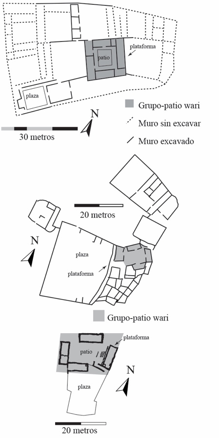 El grupo-patio wari es una estructura residencial característica de la capital Wari y de los centros provinciales monumentales. Un sitio excavado totalmente en Cerro Baúl consta de cinco habitaciones dispuestas alrededor de los lados norte, sur y oeste de un espacio casi cuadrado y una plataforma elevada en el lado este (Nash & deFrance, 2019). Las habitaciones y el grupo-patio contienen restos asociados con la preparación de alimentos, pero no con la cocción, y artefactos de producción de cerámica, trabajo lapidario y tejido. El grupo-patio está ubicado en el centro del complejo palaciego de 2060 m² aproximadamente, construido con gran habilidad. Las habitaciones tienen esquinas casi cuadradas, las paredes estaban enlucidas en blanco y naranja y los pisos estaban empedrados (fig. 5).