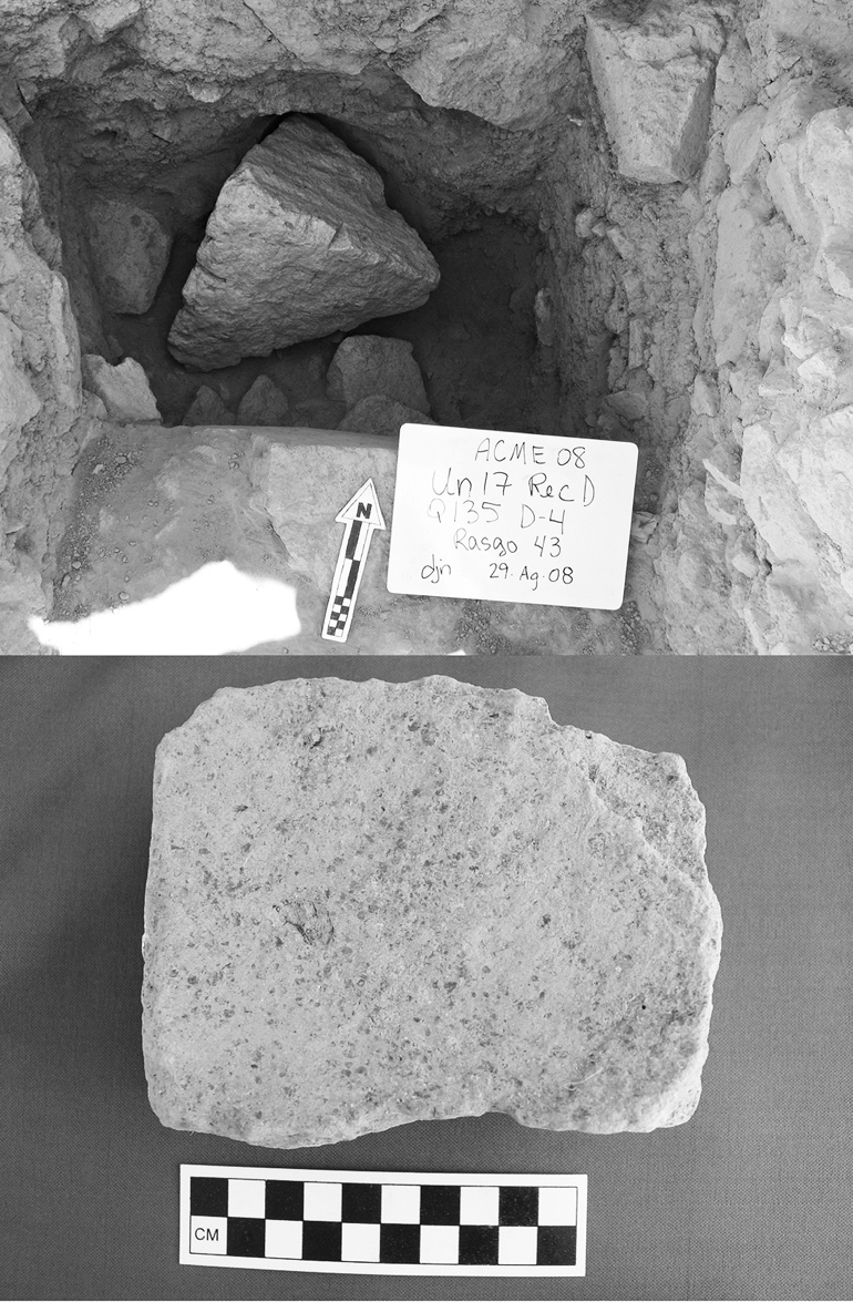En la Unidad 17 de Cerro Mejía, descubrimos una extraña cámara de piedra en el contrapiso ubicada debajo de los cimientos de la construcción de una habitación (fig. 6). En el interior, hay una gran roca que se asemeja a un felino; aún no está claro si la roca fue modificada o si es de Cerro Mejía, pero su ubicación intencional en la cámara de piedra es incuestionable. Claramente, este objeto tenía un significado especial para los residentes que invirtieron una gran cantidad de trabajo para construir esta cámara de piedra en su casa. Esta misma casa también contenía un entierro que exhibió una placa pintada que es una ofrenda mortuoria sin antecedentes locales. Las placas pintadas se asocian típicamente con áreas en el departamento de Arequipa, 200 km al norte aproximadamente, en Majes o Chuquibamba, y parecen haber sido un tipo de ofrenda importante. Tales objetos no se han encontrado en Cerro Baúl ni en sitios del Formativo tardío.