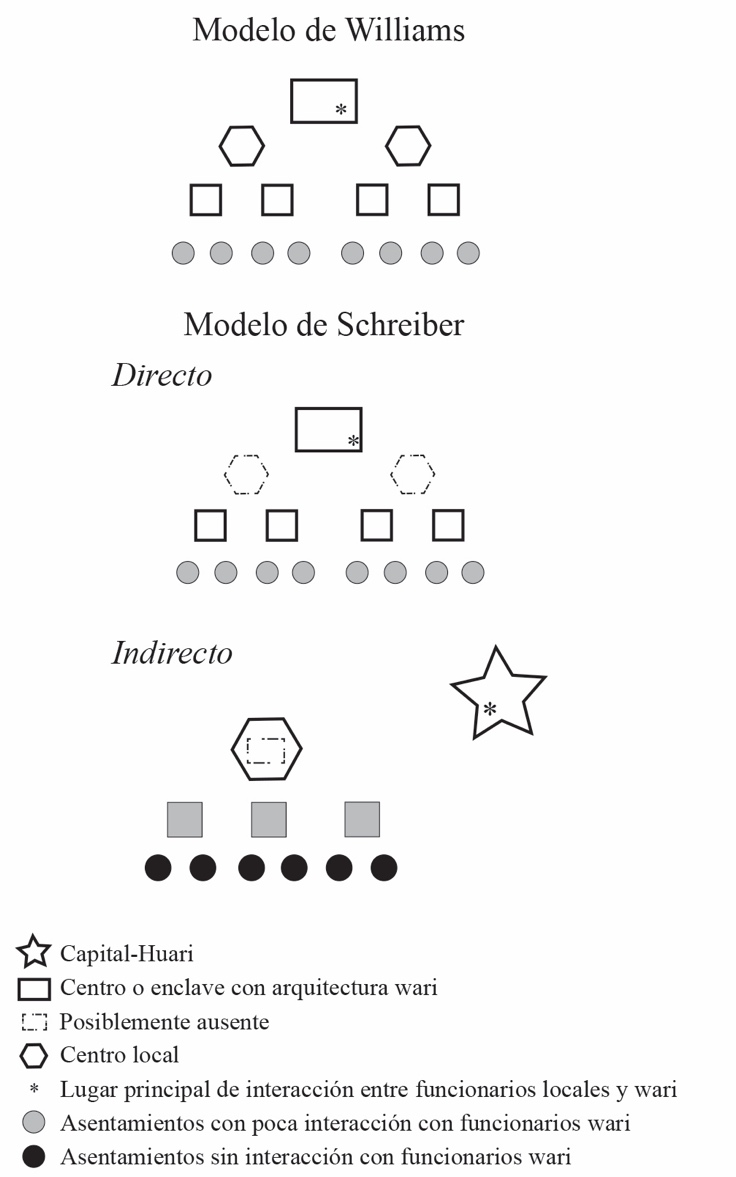 El modelo de Schreiber tiene implicaciones muy diferentes. Habría otros tipos de articulaciones entre las élites wari gobernantes en el centro y los grupos sometidos en las provincias. Estas, bajo control directo, seguirían el esquema básico de las relaciones sociopolíticas como se describe en el modelo de Williams; sin embargo, deberíamos esperar que los centros secundarios fueran pequeños y muy dispersos, en el caso de que las pequeñas organizaciones políticas de la región fueran hostiles entre sí. Si existieran zonas de amortiguamiento, se podrían establecer nuevos sitios en estas áreas durante el Horizonte medio o previamente en lugares inseguros (por ejemplo, los fondos de los valles en Sondondo, Schreiber, 1992). En áreas bajo control indirecto, no habría un centro provincial de estilo wari, pero sus representantes podrían haber establecido una embajada o enclave en un centro local preexistente. Si un líder local fuese el responsable de suministrar recursos a la capital Wari y administrar a la población, entonces debemos suponer que este visitará regularmente la capital Wari. Los lugares principales de interacción entre los wari y los locales estarían en la capital y en el centro autóctono de la política local. El patrón de asentamiento local puede no haber variado en absoluto y habría pocas razones para que los centros secundarios de una región se relacionen directamente con el personal wari, pero las élites de bajo nivel de estos centros podrían haber recibido o no algunos bienes wari (esto dependería de las decisiones del líder local). Sin embargo, pueden ocurrir transformaciones a través del tiempo. La economía local y el enfoque de las actividades productivas pueden cambiar para proporcionar recursos y satisfacer las demandas del centro imperial (ver Morris & Covey, 2006). A medida que la economía de un imperio se integra cada vez más, es posible agregar instalaciones y personal para monitorear la producción y el movimiento de productos básicos. Varias generaciones después, bajo un control hegemónico, pueden aparecer cambios en el patrón de asentamiento y marcadores evidentes de una intrusión wari.