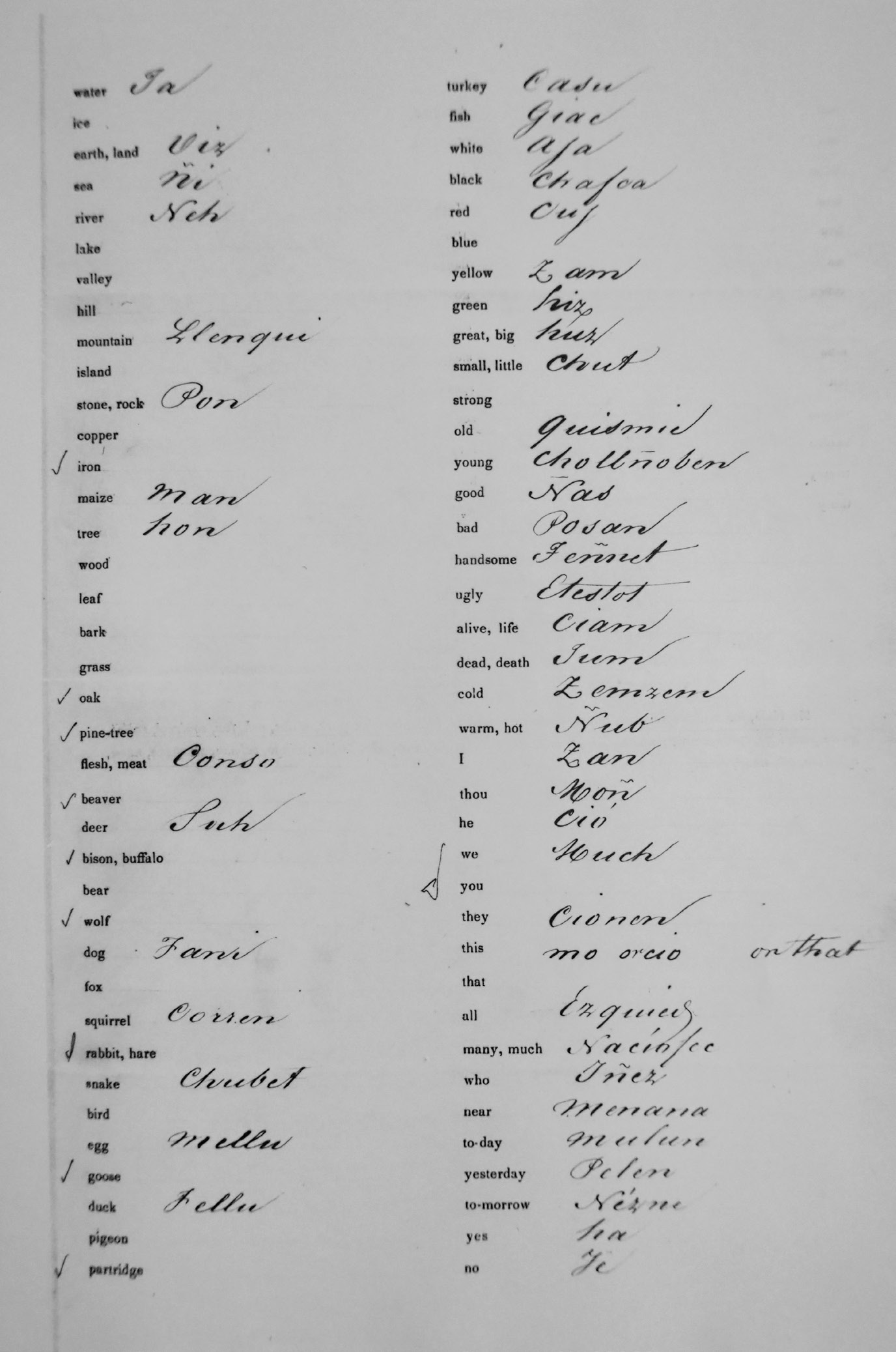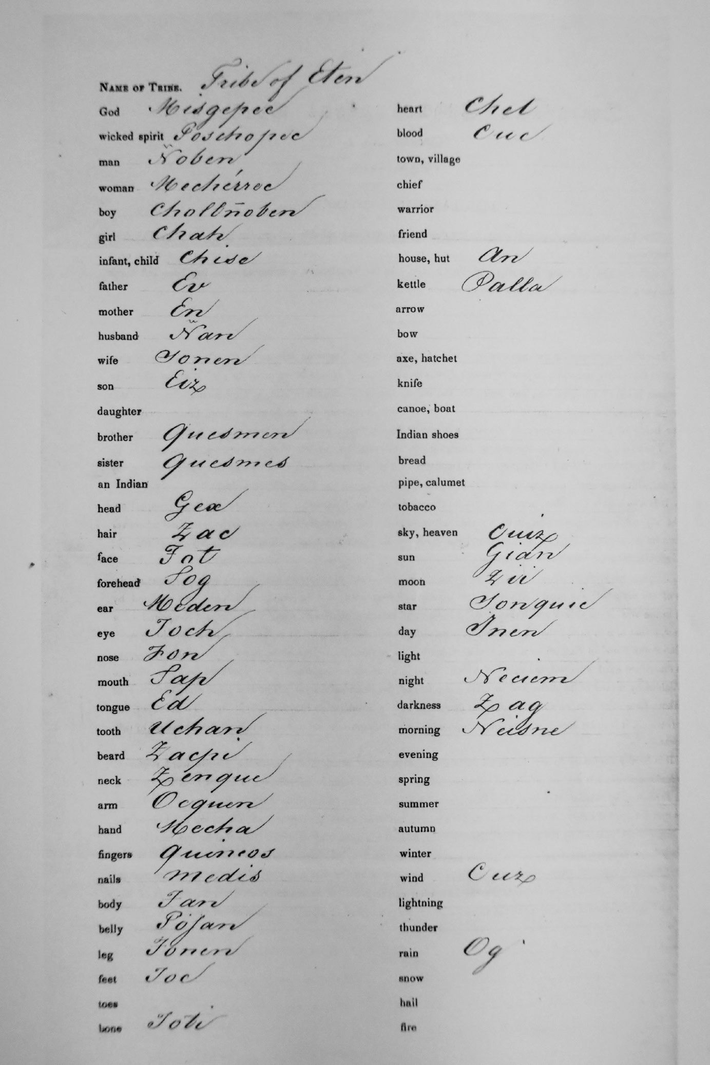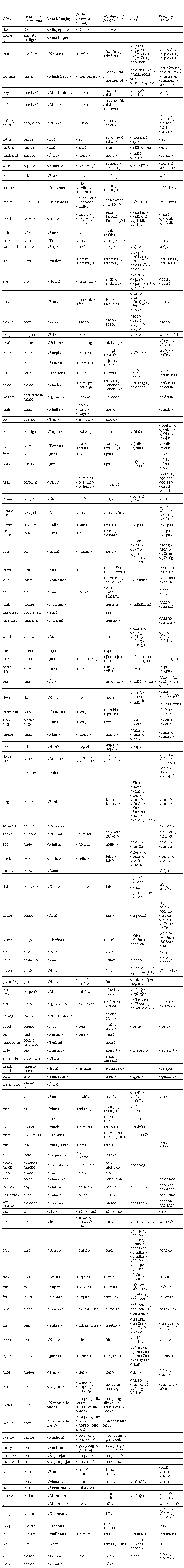 Más allá, se encuentran algunas inversiones semánticas en la lista, a pesar de que las instrucciones de la circular, como se puede confirmar en el apéndice A, enfatizan que in all cases great pains should be taken to procure the precise word required, and to make sure that it is not one of some kindred meaning «en todos los casos hay que esforzarse para procurar la palabra exacta que se requiere, y asegurarse de que no se trate de una con un significado similar». Así, para tree ‘árbol’ la lista Montjoy tiene <Hon>, que es la palabra que otras fuentes listan como el nombre del algarrobo —el árbol par excellence en la costa norte peruana— más específicamente. Para good ‘bueno’ la lista Montjoy trae <Ñas>, mientras que otras fuentes, a saber, Middendorf (1892) y Brüning (2004), están de acuerdo en que esta palabra significa, de manera más precisa, ‘bonito, hermoso’ y que la palabra más general para ‘bueno’ es <peñ> (o una forma parecida). Ahora bien, la circular también requiere la traducción de handsome ‘bonito, hermoso’ a la lengua indígena. Aquí, la lista Montjoy tiene <Teñnet>, una palabra que es interesante porque, que yo sepa, no aparece en otras fuentes léxicas de la lengua mochica. De manera interesante, la lista Montjoy también difiere en la designación del antónimo, es decir, bad ‘malo’, donde, según la lista, se usa <Posan>, mientras que las otras fuentes consistentemente tienen <piss> o formas parecidas (aunque la forma <Posan> es desconocida en otras fuentes con el sentido que le atribuye la lista Montjoy, parece posible que esté relacionada con el sustantivo <porsan> ‘veneno’ que documenta Middendorf [1892]).