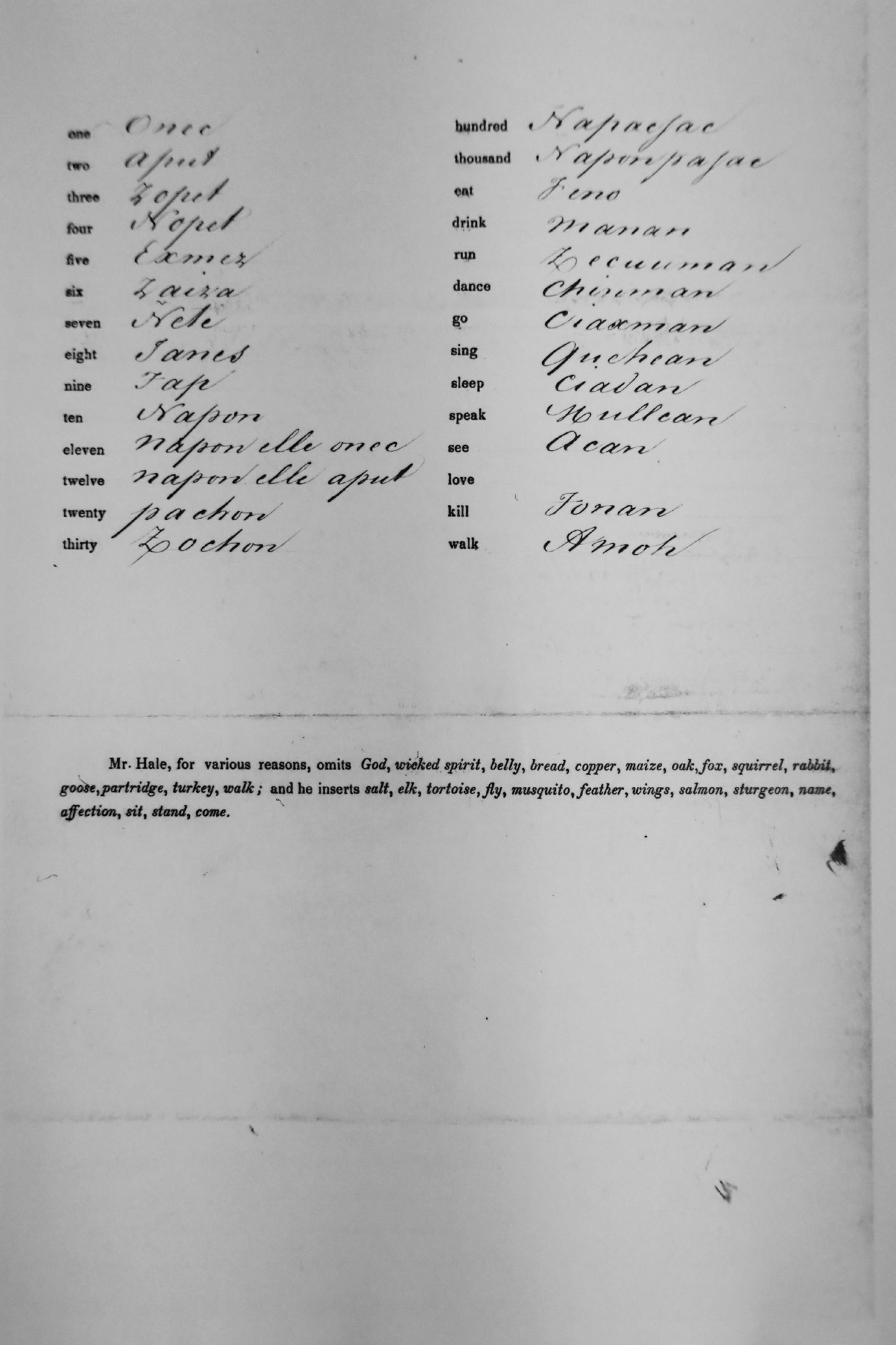 La circular estuvo acompañada de una lista de 180 palabras en inglés, con un espacio a su derecha convenientemente dejado en blanco para ser llenado con los equivalentes en lenguas indígenas según las instrucciones que la circular especifica.