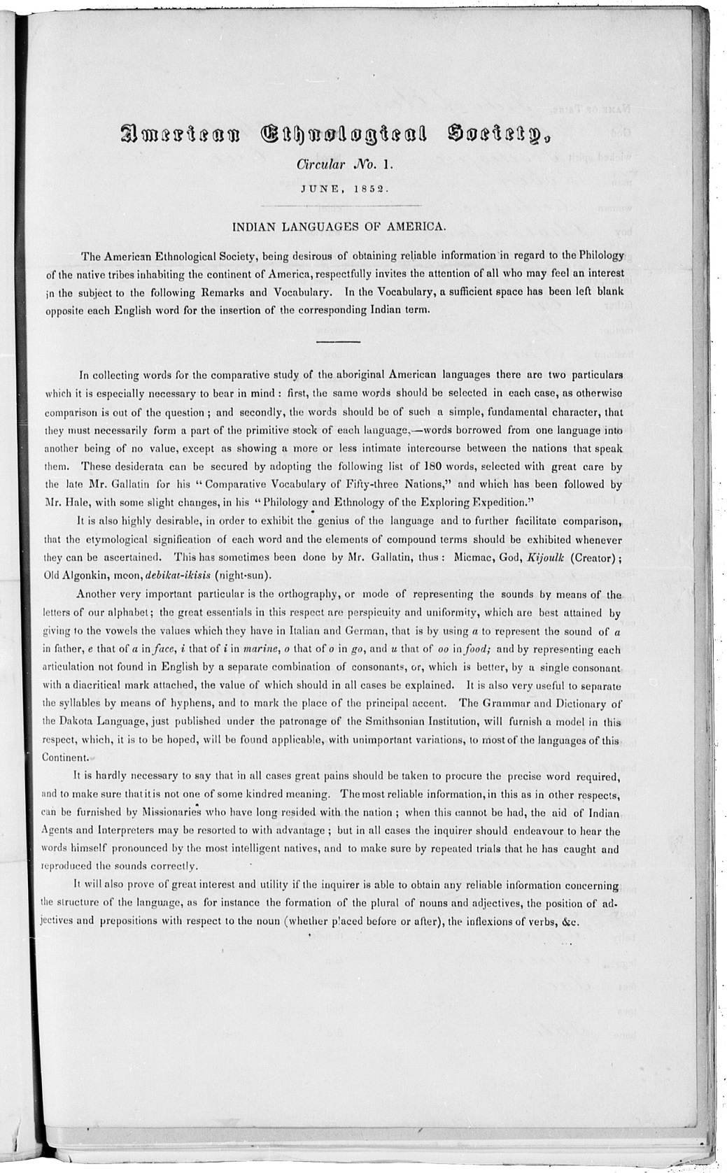Diez años después de su fundación por Albert Gallatin y John Russell Bartlett, la American Ethnological Society emitió su primera circular en junio de 1852. En el documento mencionado, titulado «Indian Languages of America», se pidió a partes interesadas que manden vocabularios de lenguas indígenas a la Sociedad, con el fin de mejorar los conocimientos de las lenguas y sociedades americanas. Ya que es de interés general para la historia de la lingüística americana, se incluye un facsímil de la circular en el apéndice A.